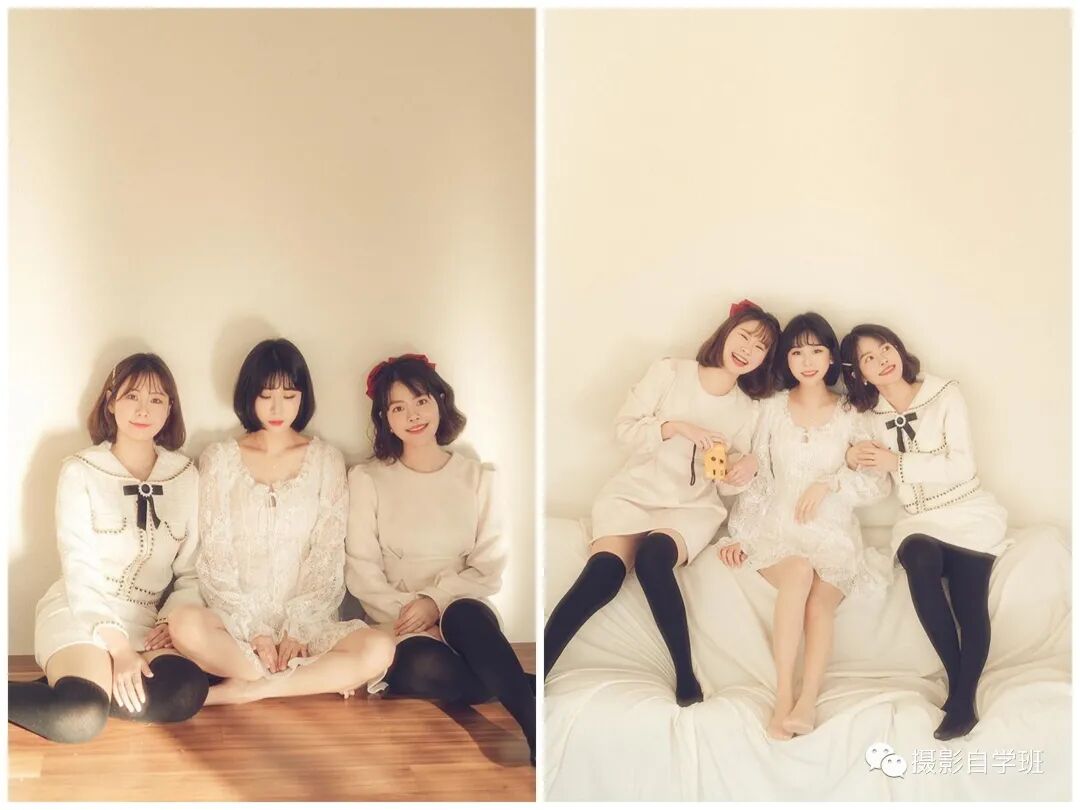 在家中摆姿也非常简单,闺蜜三个人都坐到墙边,窗户的光,让人的影子投在墙上,两个人看一下镜头,中间的人盘腿坐在中间,看向地面。或者三个人,都坐在床头依偎在一起,摄影师在拍摄时要注意引导,让被拍摄的人脸上有欢快的笑容。