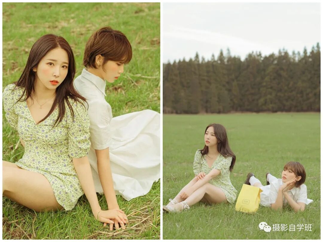 在草地上除了摆出背靠背的姿势,还可以一个人趴在地上,另外一个人坐在地上看向远方,两个人都不看镜头,但是如果照片想好看的话,最好选择一个晴朗的天气,像上图右侧这张照片,背景的天空惨白一片,细节就不那么理想了,除了摆姿势以外,室外的环境也很重要。