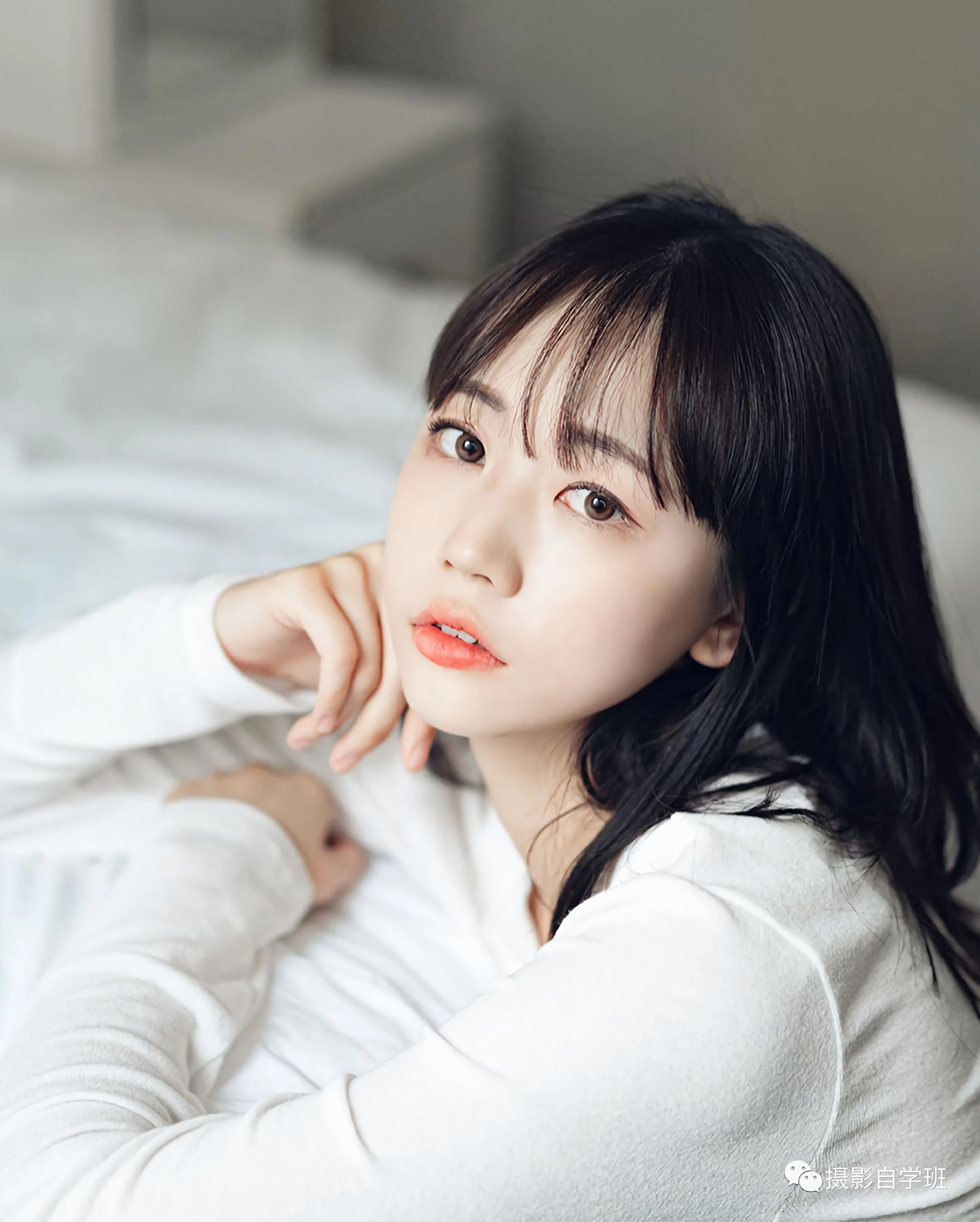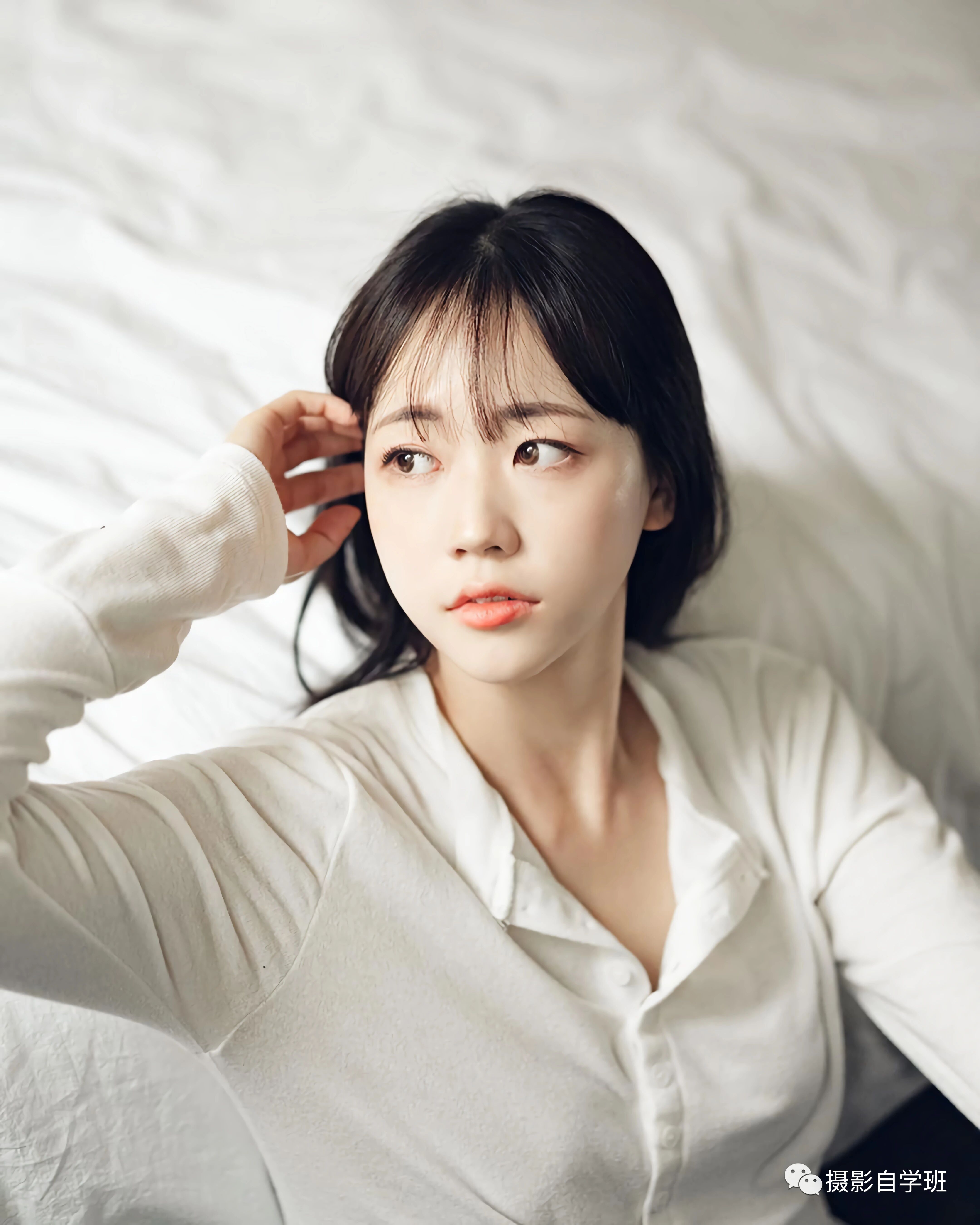 在家中怎么能摆出好看的姿势呢?我们完全可以用好家中的床铺,人穿的衣服和床铺,都是白色,让照片显得更加纯洁,可以像上图一样,一个手留头发,眼睛看向窗外,窗口光可以为人的面部进行补光,还可以像下图这样,趴在床上,一个手放到床上,另一个手放在下巴处,看着镜头,姿势和环境都可以拍出一种放松的感觉。