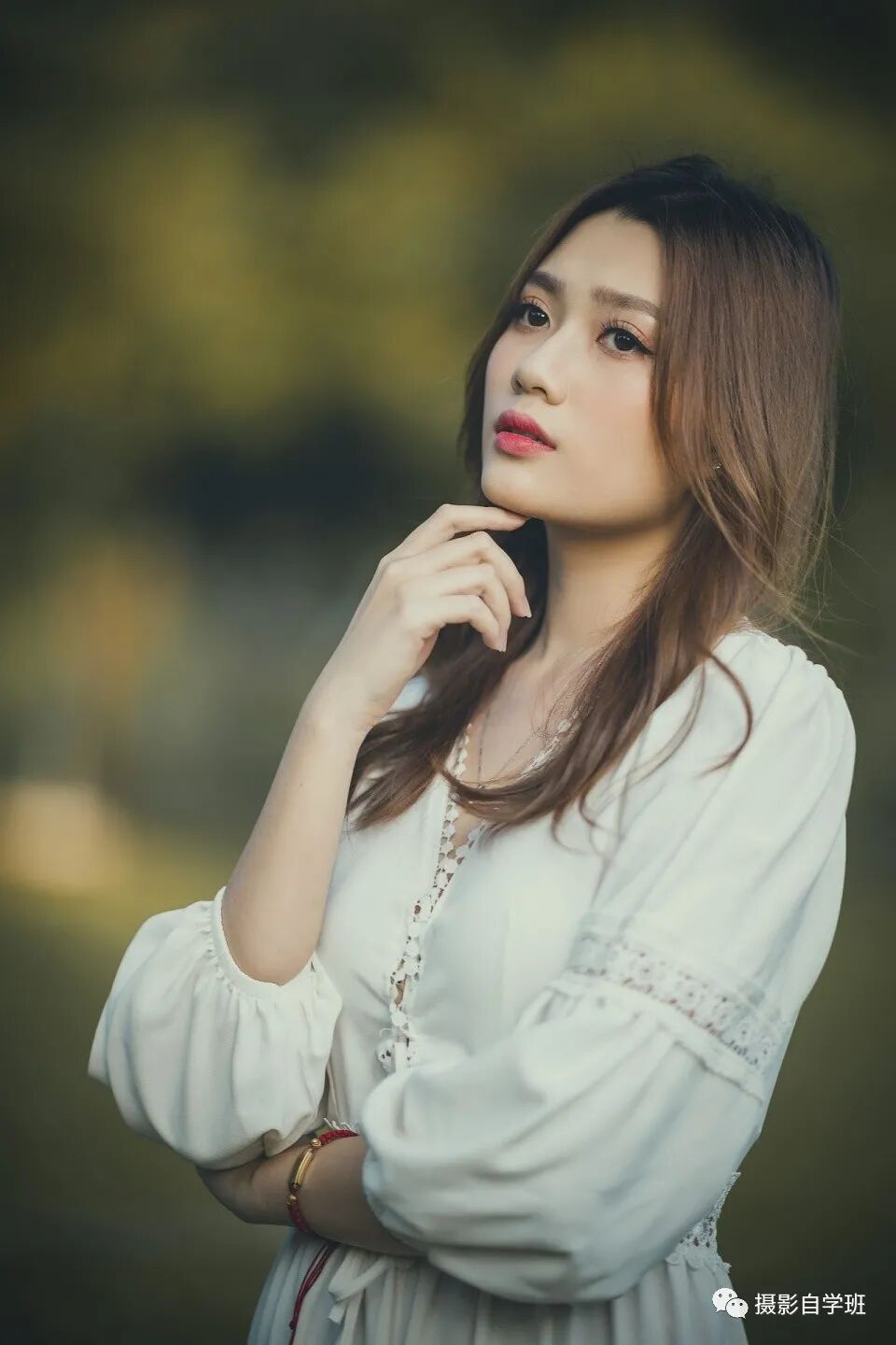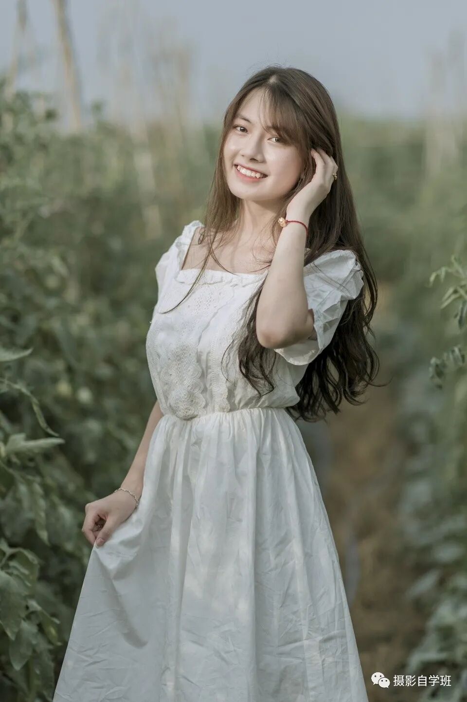 姿势四:一只手撩头发,抚媚不妖,甜美自然,另一只手轻轻的掀起一点裙子,有一个下意识的动作,这样画面不呆板。