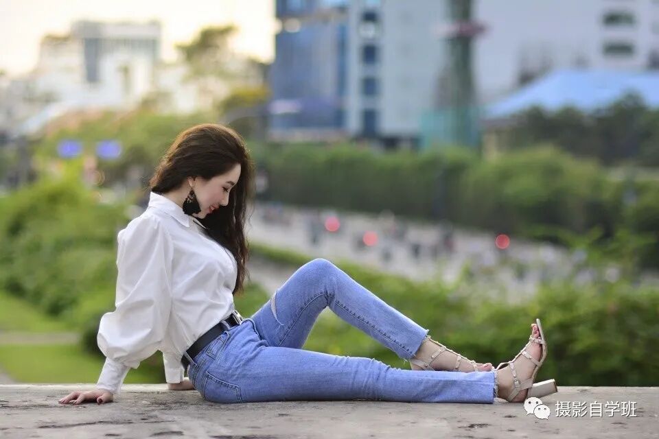 姿势三:坐在一个平坦的地方,双手放在身后的地下,形成一个着力点,一条腿放平,另一条腿支起来,稳稳的三角形构图,呈现在画面中,这样的姿势学起来,既没有难度,又比较耐看。