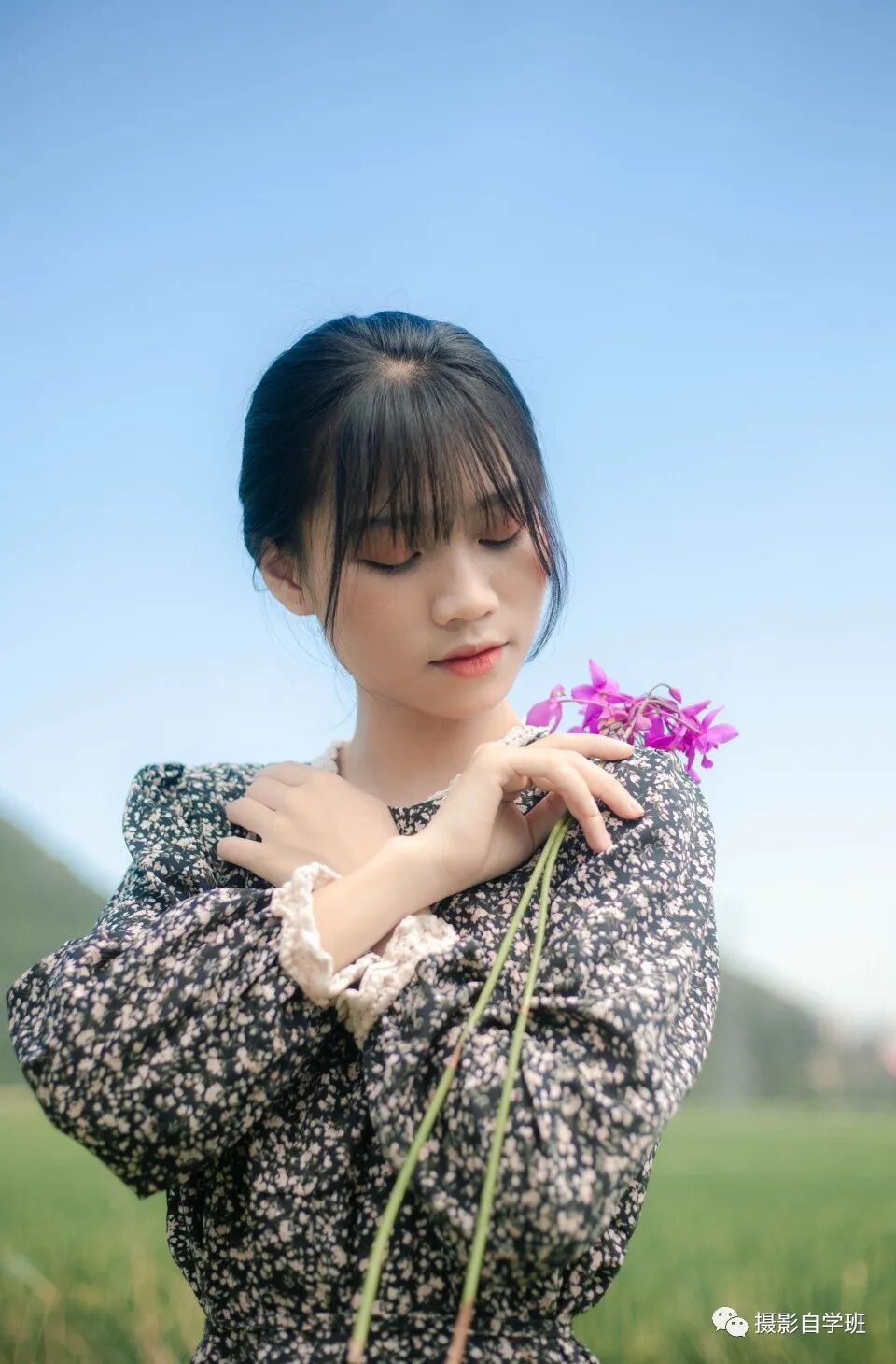 姿势二:双手交叉形状,放在肩膀上,可以用一小支花,做装饰,脸部转向小花的方向,尽情享受大自然的感染力,舒适又放松。