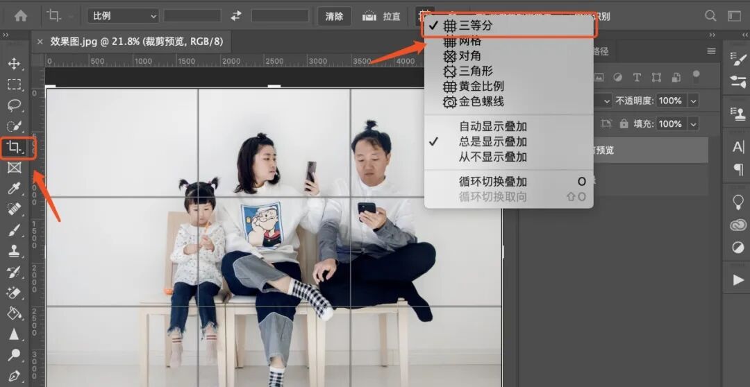 6、居中构图:裁剪工具选中图片,在上方的设置裁剪工具中选择三等分,把图片裁剪到居中位置,点击回车,即可完成裁剪。