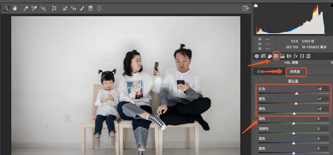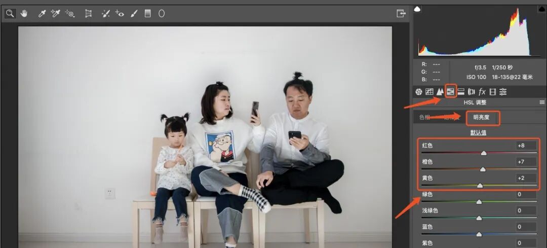 4、调整图片-肤色调整:我们大部分肤色的组成颜色为橙色,偶尔有红色和黄色,所以给这几种颜色分别降低了饱和度,增加了明亮度,可让肤色看起来更白皙,切记数值不可过大或者过小,看着肤色正常即可。