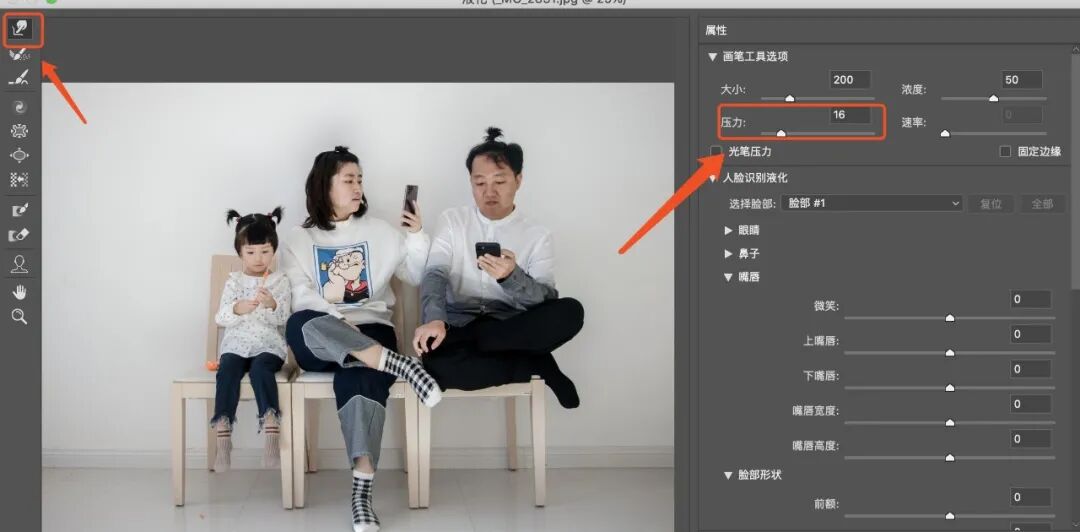7、液化:液化工具大部分是用来调整人物的胖瘦的,滤镜-液化,快捷键为ctrl+shift+x,在弹出的面板中,选择向前变形工具,调整需要调整的地方,画笔的压力尽量控制在20左右,因为画笔压力太大,使用不当,会变形严重。