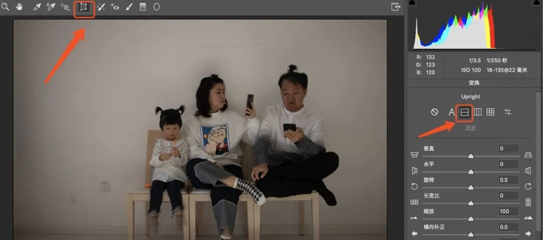 2、调整图片-矫正水平:滤镜-camera raw滤镜,在弹出面板的上方,点击变换工具,找到水平,自动就矫正了,这个仅限于矫正水平,如果还要矫正其他地方的话,回到第一栏里面,进行手动矫正。