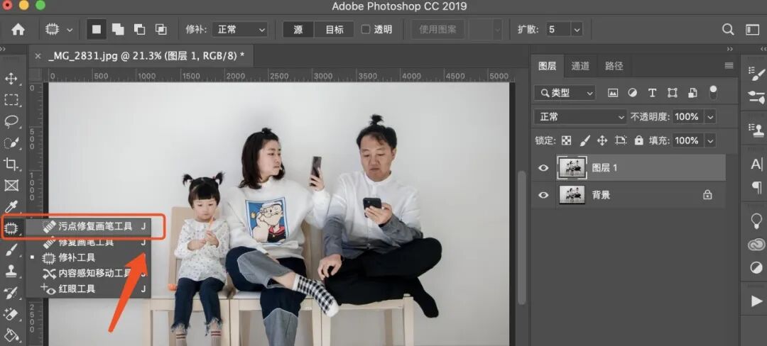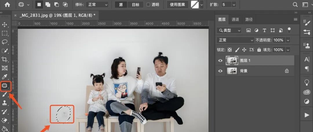 5、去除图中杂乱的地方:合并可见图层,快捷键为ctrl+shift+e,同时再复制一个新的图层,用修补工具圈中要修改的地方,直接拖拽到干净的地方。
