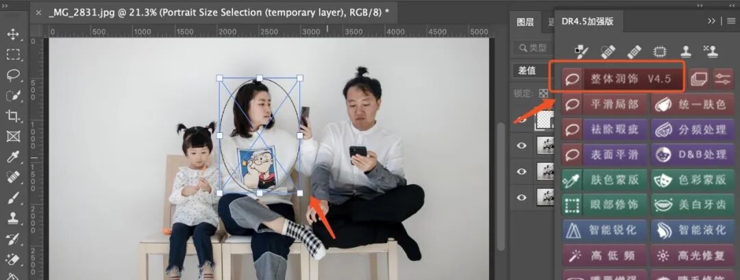 8、磨皮:用污点修复画笔工具,直接点击脸上的逗逗,就能去除,磨皮这里用到的是DR4.5的磨皮插件,点击插件,选择第一项,整体润饰,画面会出现一个框,把框移动到皮肤的位置,它自己就可以计算皮肤的磨皮程度,然后用画笔工具把皮肤擦出来了。