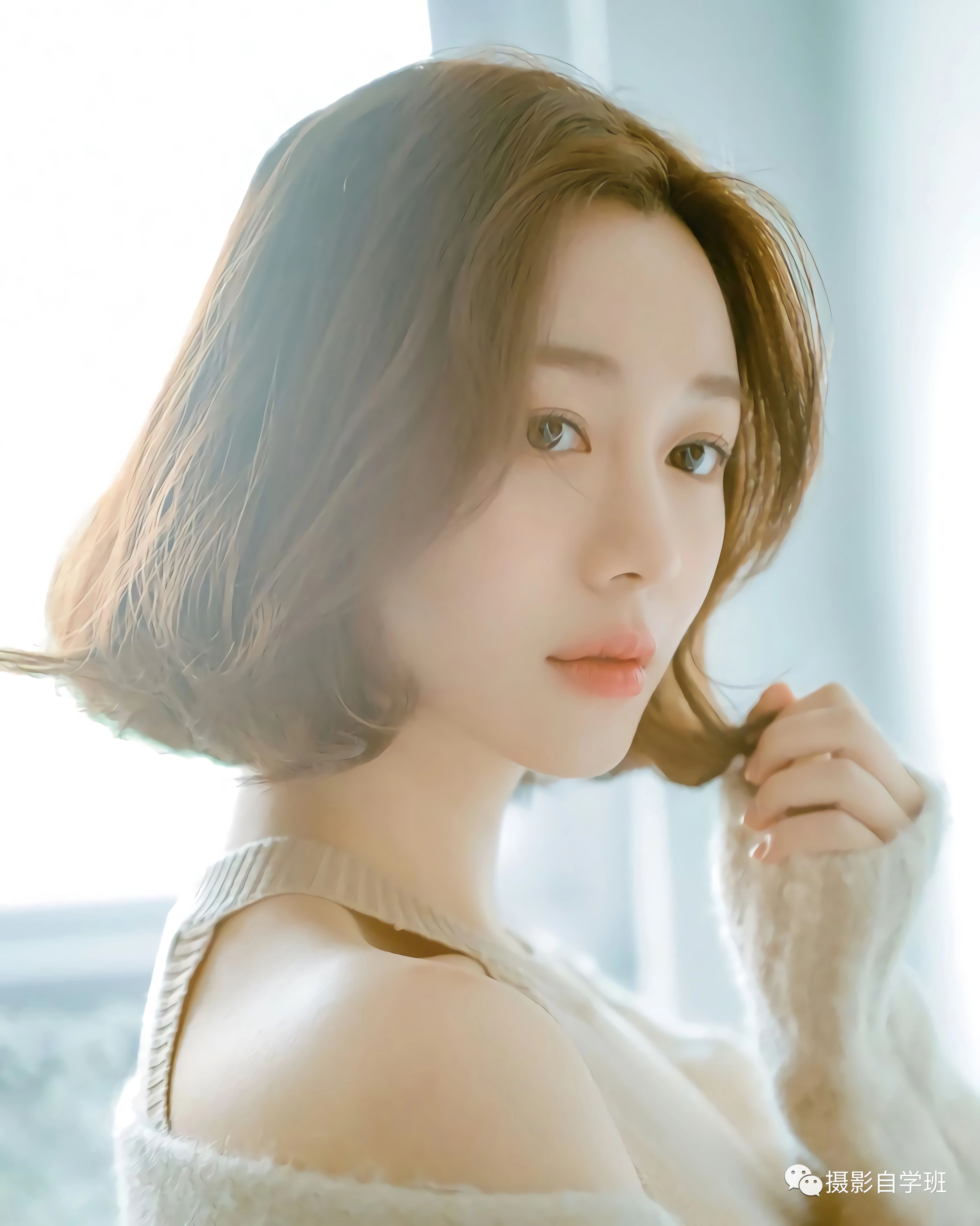 居家拍摄的时候,还可以让手摆弄头发,像上图这样,眼神还是不看镜头,或者像下图这样,用手摆弄头发,眼神看向镜头。手可以像上图和下图这样,放在头发的一角,也希望能帮你开发出更多姿势。