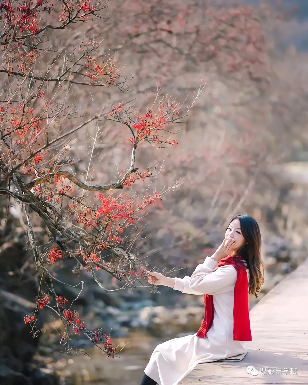在外旅行遇到上图这样的栏杆,或者下图这样的墙体,可以让被拍摄的人坐在上面。像上图这样,侧身扭头看向镜头。或者像下图这样,一只手挡住嘴,另外一只手放在树上。如果坐得比较高,摆姿不是重点,安全才是第一位的,一定要注意安全。