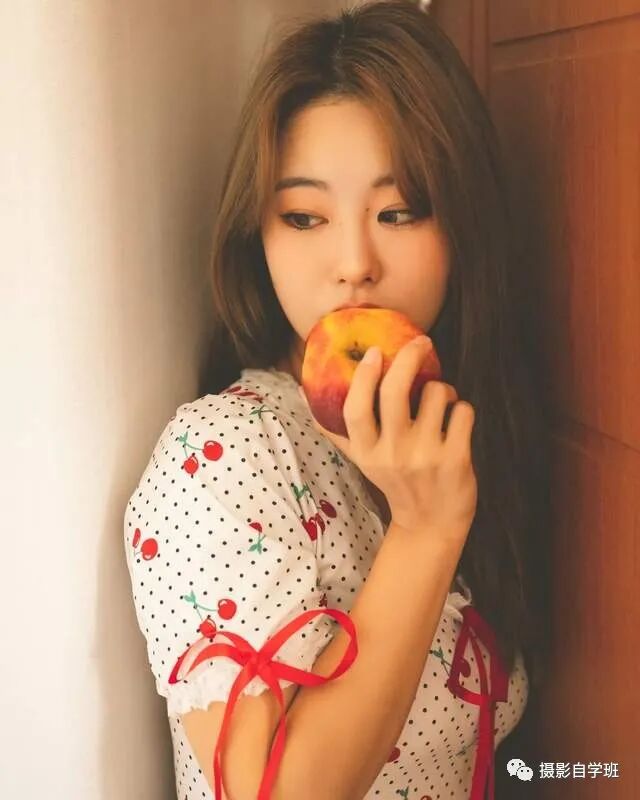 很多朋友在拍摄人像的时候,不知道怎么摆姿势,他所犯的错误,就是不知道使用道具。告诉你一个小技巧,可以使用一些道具。比如像上图这样的勺、蛋糕或者下图这样的苹果,都可以丰富你照片的姿势。使用道具,这个小改变,可以让你人像照片的姿势,丰富起来,被拍摄的人,显得更加自然。