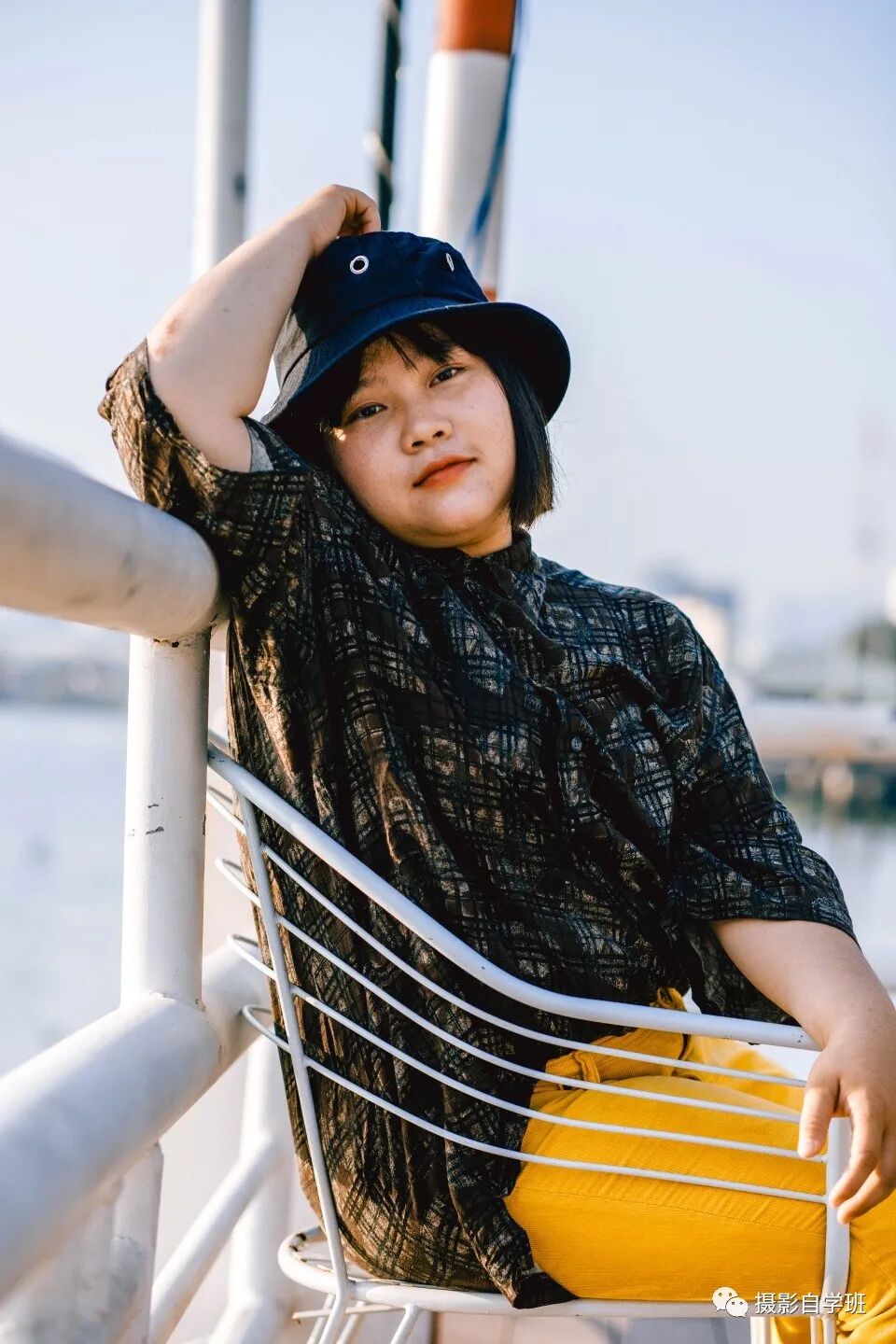 稍微富态的人,不建议像上图这样坐在那里,这样会显得腿非常粗,腰也非常粗,整个肉都堆在一起,把本来就胖的人拍得更显胖,而摄影师应该引导被拍摄的人,靠在栏杆上,侧身拍摄,这样可以显得相对苗条。瘦和胖都是相对的,摄影师引导出正确的姿势,可以为照片加分。