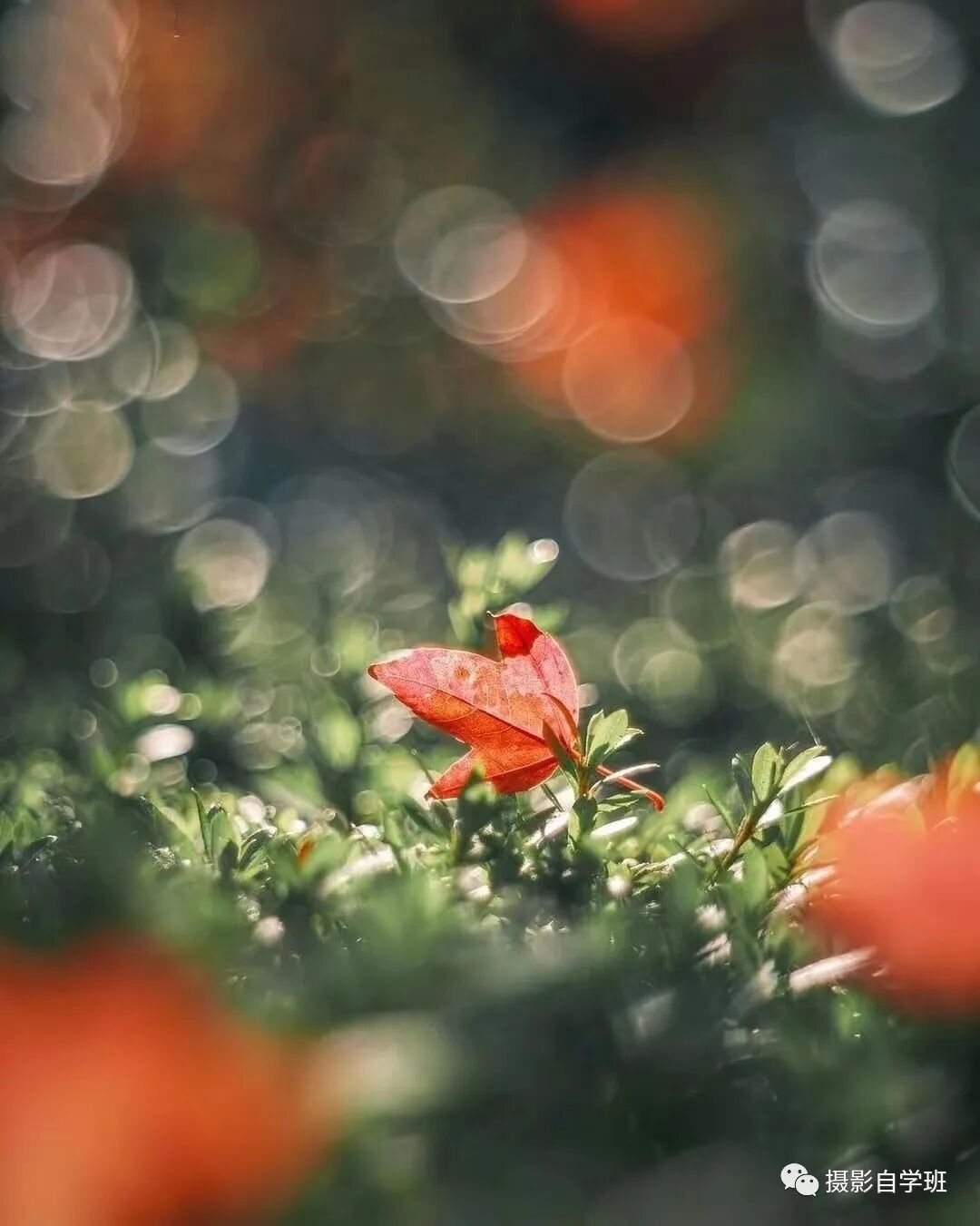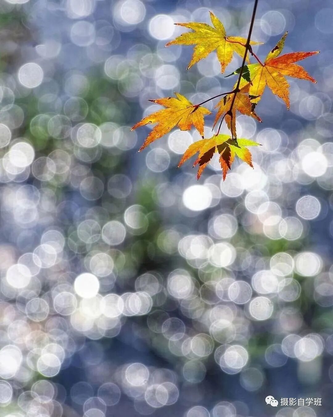 当背景非常绚烂,有缝隙光的时候,使用大光圈镜头,就能够拍出上图与下图这样,漂亮的光斑了。这里重点就是,前景主体的颜色,要与背景,有一定的差别,这样颜色上有差别,照片才会更好看,即使是一些小树叶,也能拍得非常美观。