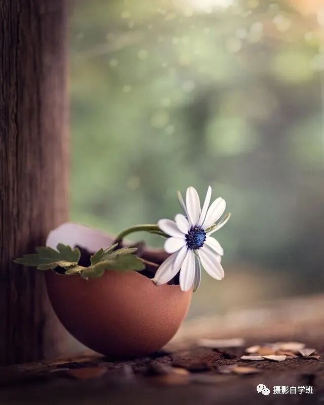 首先可以像上图这样,保障背景颜色统一,这样主体花朵颜色,稍微鲜艳一点,与背景做好明显颜色区别,照片看起来,就会更加简约、简单,干净、漂亮。或者像下图这样,找一些室外的场景,作为背景,小花朵放在蛋壳当中,因为背景距离主体花朵,比较远,对焦在前景主体花朵的时候,背景就能够形成漂亮的虚化了。你搭建场景,小植物照片,也能看起来,更有空间感,更有立体感。