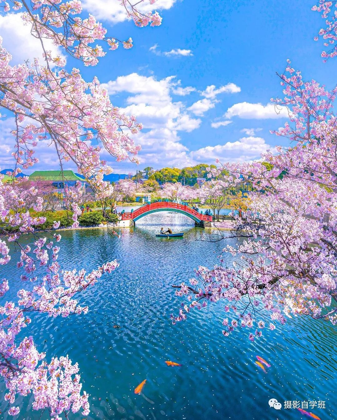 有的层次现场就具备,有的层次,需要你寻找,与创造。像下面这张照片,前景,左右,两侧的花树枝条,就形成了不规则的相框,中间水面上,有人、有红色的桥,远处有蓝天、白云。主要的一点就是,画面前景当中的花树,为照片增加了层次,你在拍摄的时候,也要学会寻找这种角度。