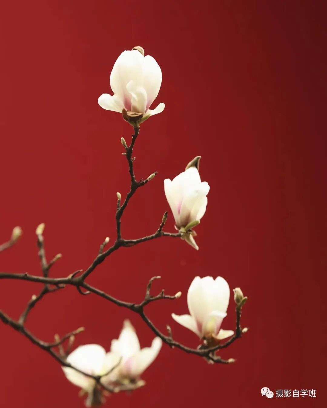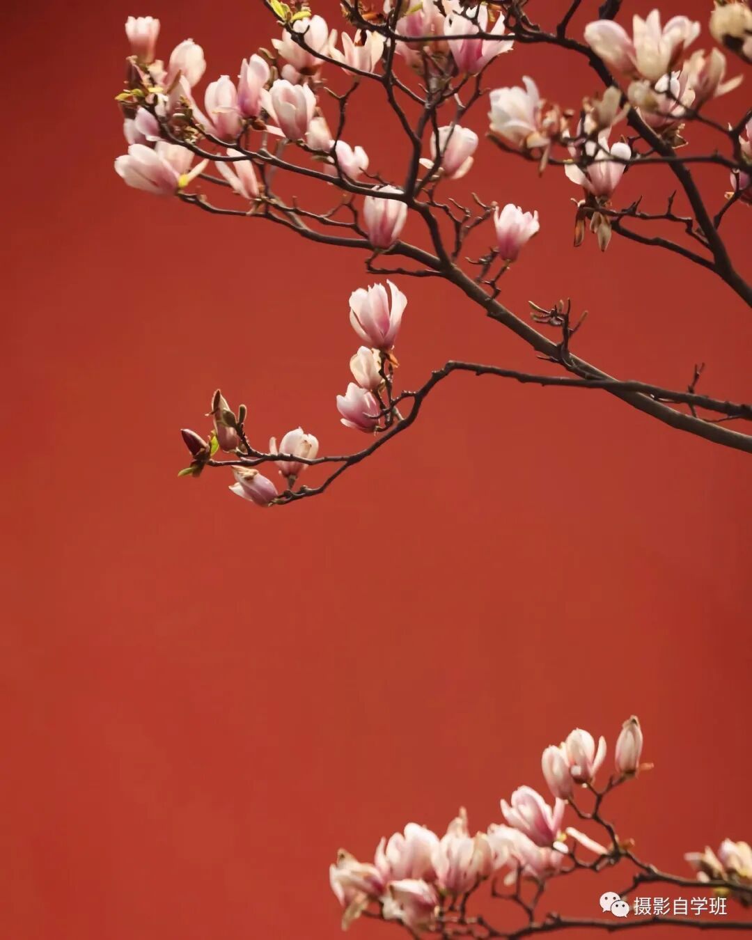 当遇到围墙的时候,一定要利用好它,像上图与下图这样,红色的背景墙,会让你的照片看起来更加有艺术感,但在拍摄之前也要做足准备,多数的时候,需要自己带个凳子,这样才能在公园或者景区,更完美的避开,地面上杂乱的人与景物,能找到更好的角度,让红墙作为背景。当纯色背景,出现在你的玉兰花照片上时,你的花朵照片,就会更具有艺术感了,简洁又干净。