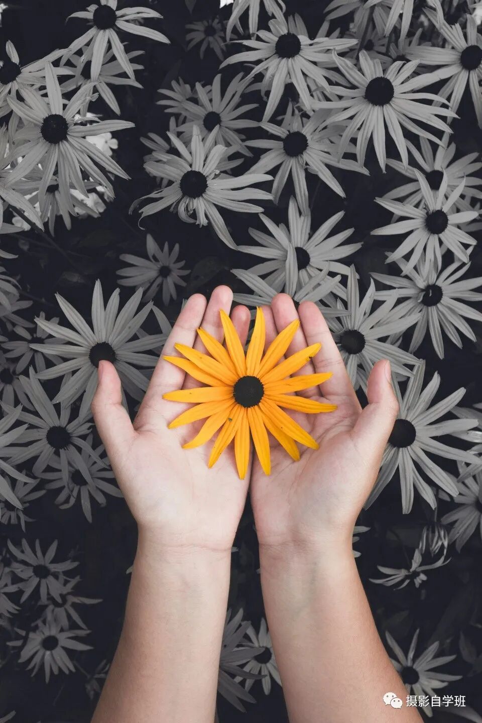 我们只为突出中间的一朵小花,所以给周围的花朵做了去色处理,视觉上是不是有了不一样的效果。如例图中强调,手心中的花朵,经过周围去色的处理,更为视觉中心了。