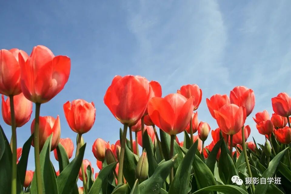 离花朵稍近一些,采用仰拍的角度,以天空为背景,干净利索。