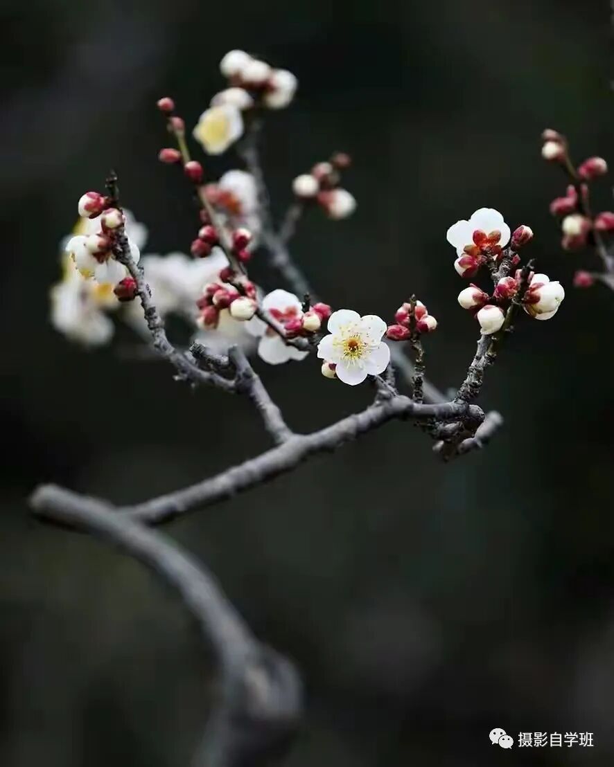 照片被拍成黑色背景,还有纵深感,就会更加耐看了,如果遇到一些枝条上的花朵,可以像图12这样,顺着枝条向前拍,枝条能够形成很好的引导,来增加照片的纵深感。