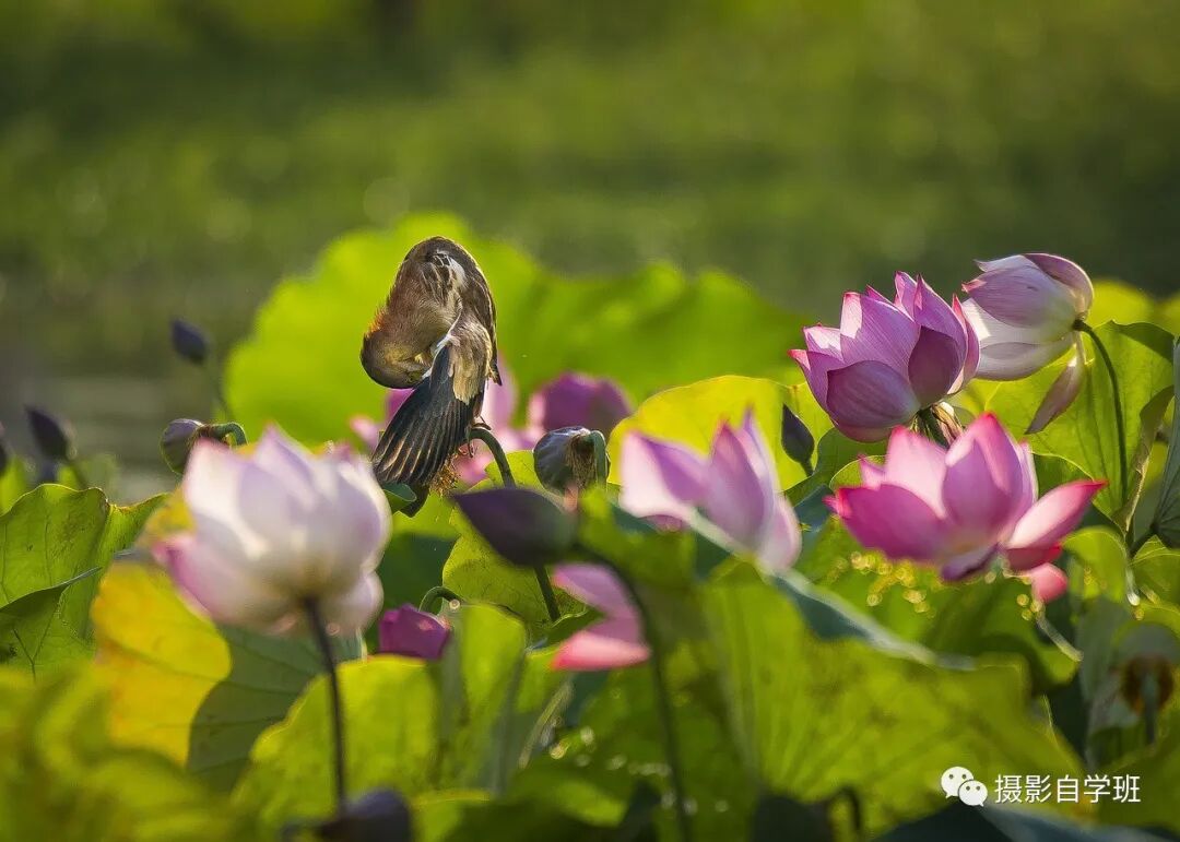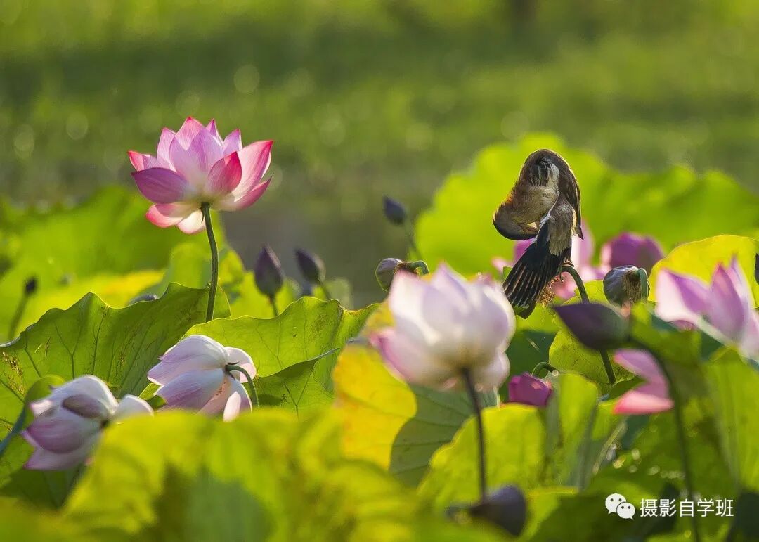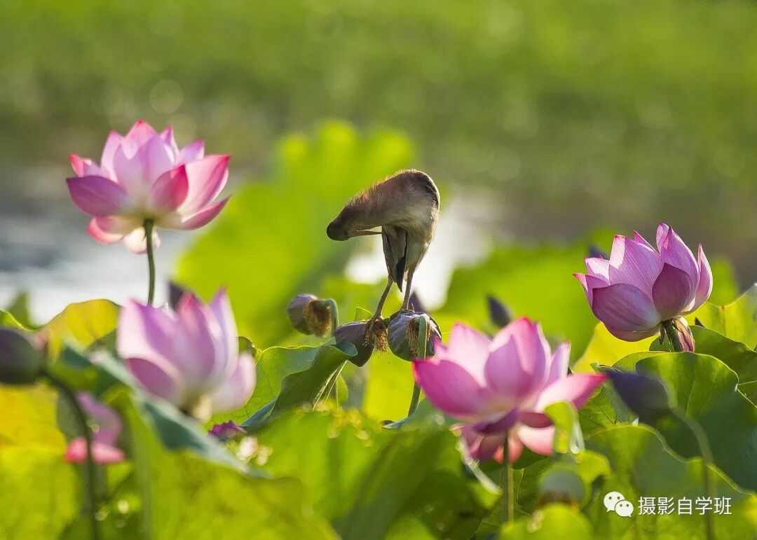 再看图6这张照片以水鸟为主体,水鸟清晰,翅膀透明,并且后方又没有过于抢戏的荷花,图7也是正确的,图7背景的荷花也是清晰的,前方的鸟儿也是清晰的,在同一焦平面之内,即使人的视觉被后方的荷花吸引去了,但也不会落空。