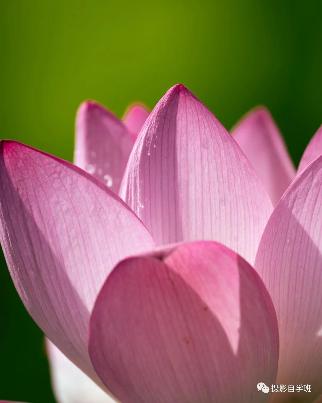 在拍摄荷花时,光线是非常关键的因素。如果你想要拍摄出更加迷人的照片,那么你可以尝试使用柔和的逆光来拍摄荷花。为什么说逆光朝向东呢?因为荷花晚上就闭合了,从清晨开始,是逐渐绽放的,所以要在清晨时分,逆光拍摄,也就是朝向东方拍摄,就能拍出图7和图8这样清晰的纹理了。