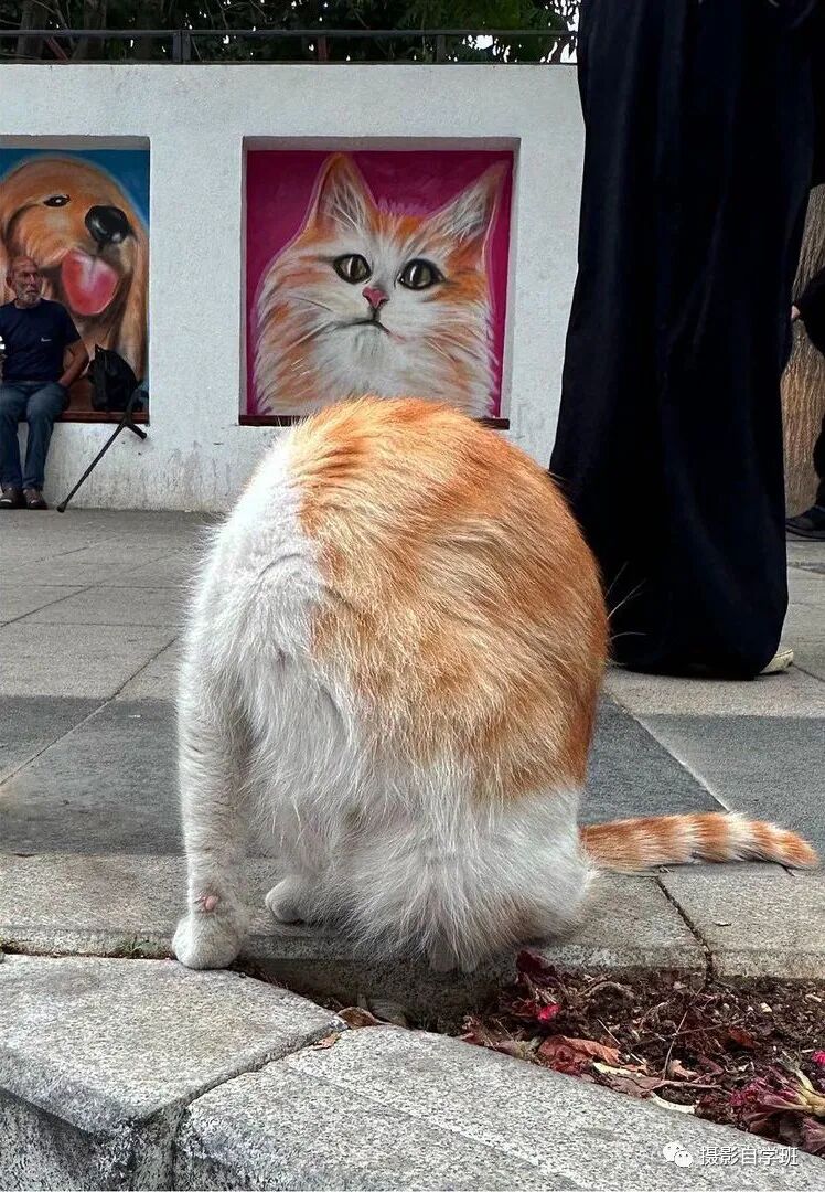利用方向对比,图1中影子的人向右侧,影子内的人,头是向左的,两者都有帽子,这个帽子就是关联,方向相反,就会增加趣味。或者利用错位关系,看图2,即使没有光影,单纯的错位,远处广告牌子上的猫头,正好与近处的猫,形成错位关系,就会给手机拍的照片增加趣味了。