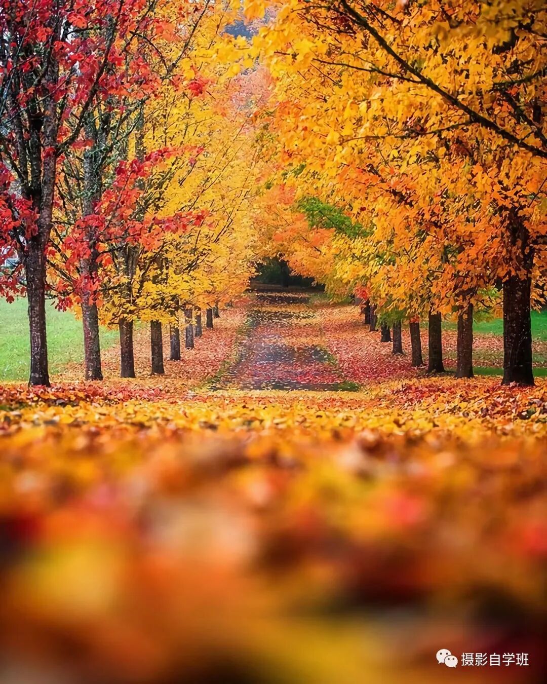 无论你是拿起手机,还是拿起相机的时候,都要注意改变一下拍摄角度,尝试一下,像图2与图3这,样蹲在地上拍摄,图2这里蹲到地上,把相机放到地面,前景挨近镜头的落叶,就能够被拍得虚化,这个角度与我们日常看这条路,有很大差别,所以照片看起来,也会更加特别,图3是蹲到地上之后,寻找两片比较大的落叶,这样纹理清晰,把落叶罗在一起,用落叶形成的缝隙,向前拍摄,视角不一样,画面又非常有创意,会让你的照片,看起来更加不同。
