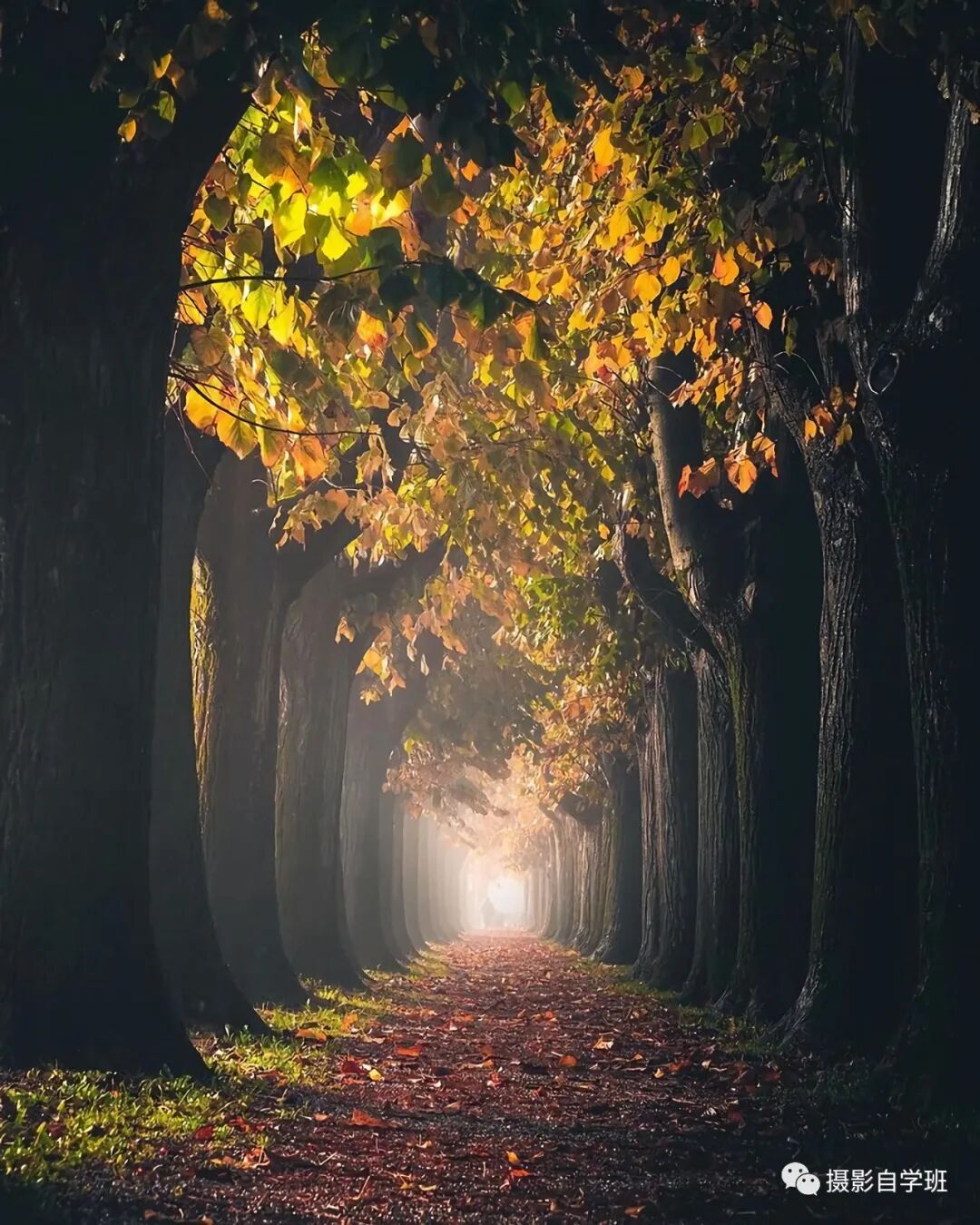 照片是二维的,从二维的画面当中,怎么能够让你的风景,体现得更加立体呢?最简单的方法就是像图8与图9这样,寻找线条,这个线条,可能是像图8这样的一条路,也可能是像图9这样,有一条路的同时,路的两侧,有成规律递进向前的树,这样成规律的树,会给你的照片增加立体感,还能给照片增加韵律感。遇到线条,不只是要顺着线条向前拍,还要像图9这样,寻找明暗关系,照片当中,有明有暗,画面看起来才会更加斑驳,细节好,照片才会更耐看。