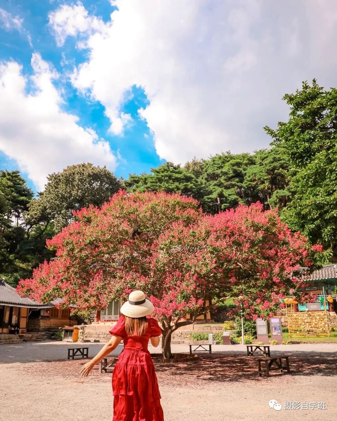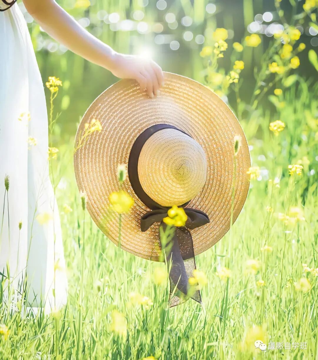 还可以像图6这样,准备一顶帽子,拍摄的时候,如果人站在照片的一侧,那要让身上穿的裙子,垂直于地面,这样画面看起来,才会横平竖直,更加稳定,一定注意,不要倾斜,这是重点。