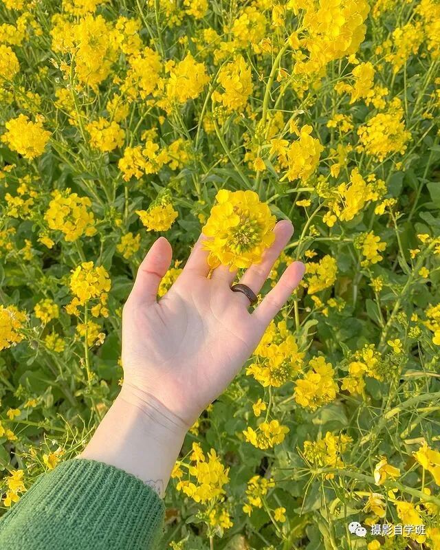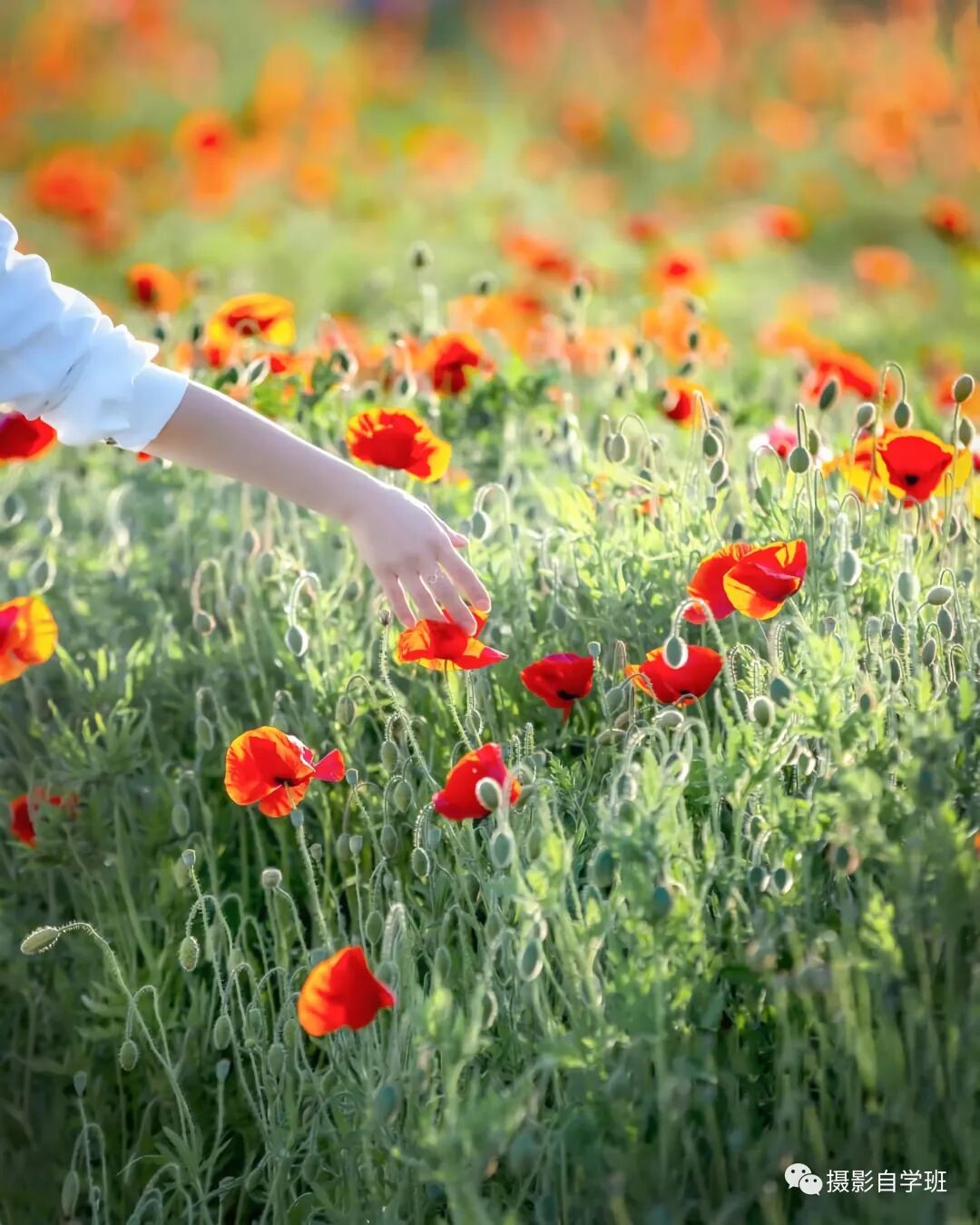 拍摄不露脸的人像照片,既然不好意思面对镜头,干脆就在画面当中,不显露出脸,也不显露出头部,可以像图4这样,伸手摸着身旁的花,或者像图5这样,把手放在花下,但这两张照片,明显图4更好看,这是因为,光从侧逆光的方向来,让花朵的边缘,更有质感,叶片透光,纹理清晰,也更加好看,而图5就是从上往下拍,画面看起来,有些一般。