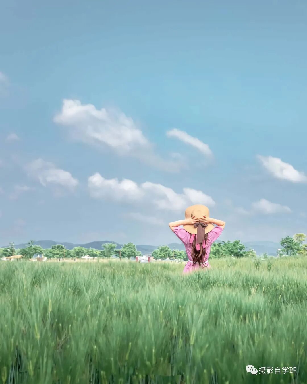 图10是在一片长得比较高的草中拍摄的,让被拍摄人的衣服颜色,与现场的环境有区别,这是重点,并且摄影师拍摄时,也要蹲下一点,这样高高的草,就能够在画面当中,占一定比例,下方1/3,是一个不错的选择,前景的虚化,可以增加照片的层次,人离背景的天空,有特别远的距离,这样空间感,就会更好。