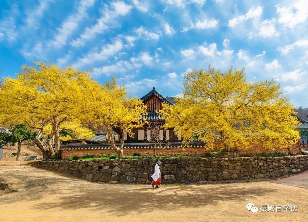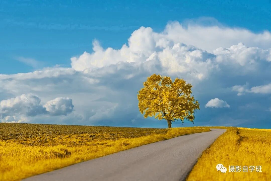 在拍摄风光照片时,合理利用点缀元素,可以让画面更加生动有趣。例如,天空中的白云、远处的鸟群、地面的石头等都可以成为画面的点缀,增加对比和层次感。看例子,图6,如果只拍摄地面、大树、房屋和天空,那非常普通,而等有一个人经过,小小的人,与大大背景形成对比,照片的张力,就来了。