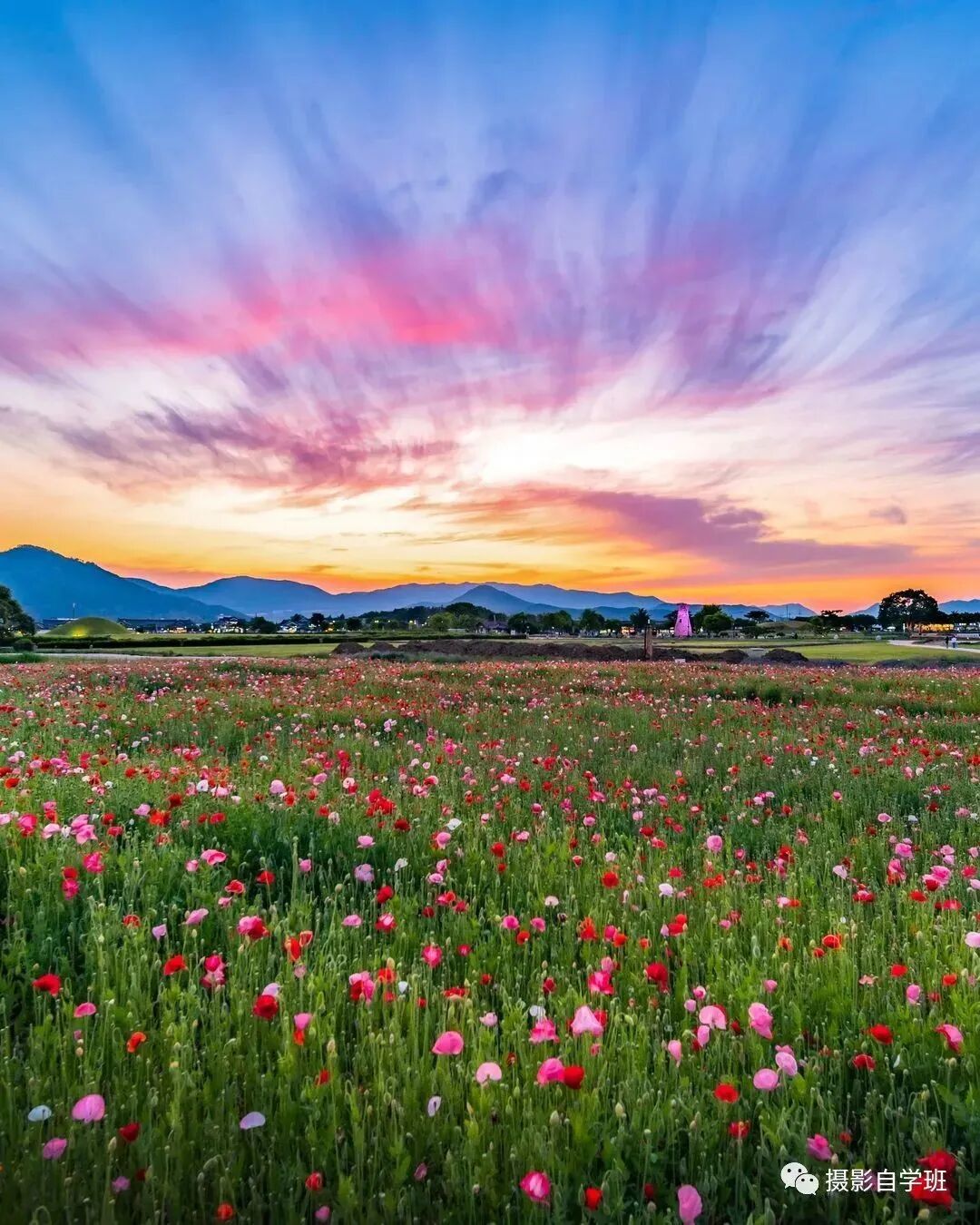 此时一定要注意,选择有云彩并且有风的天气,如果云彩静止不动,或者移动很慢,那需要曝光很长时间,拍摄难度比较大。但如果你想让下面的花是不动的,是清晰的,需要拍两张照片,后期合成一下。