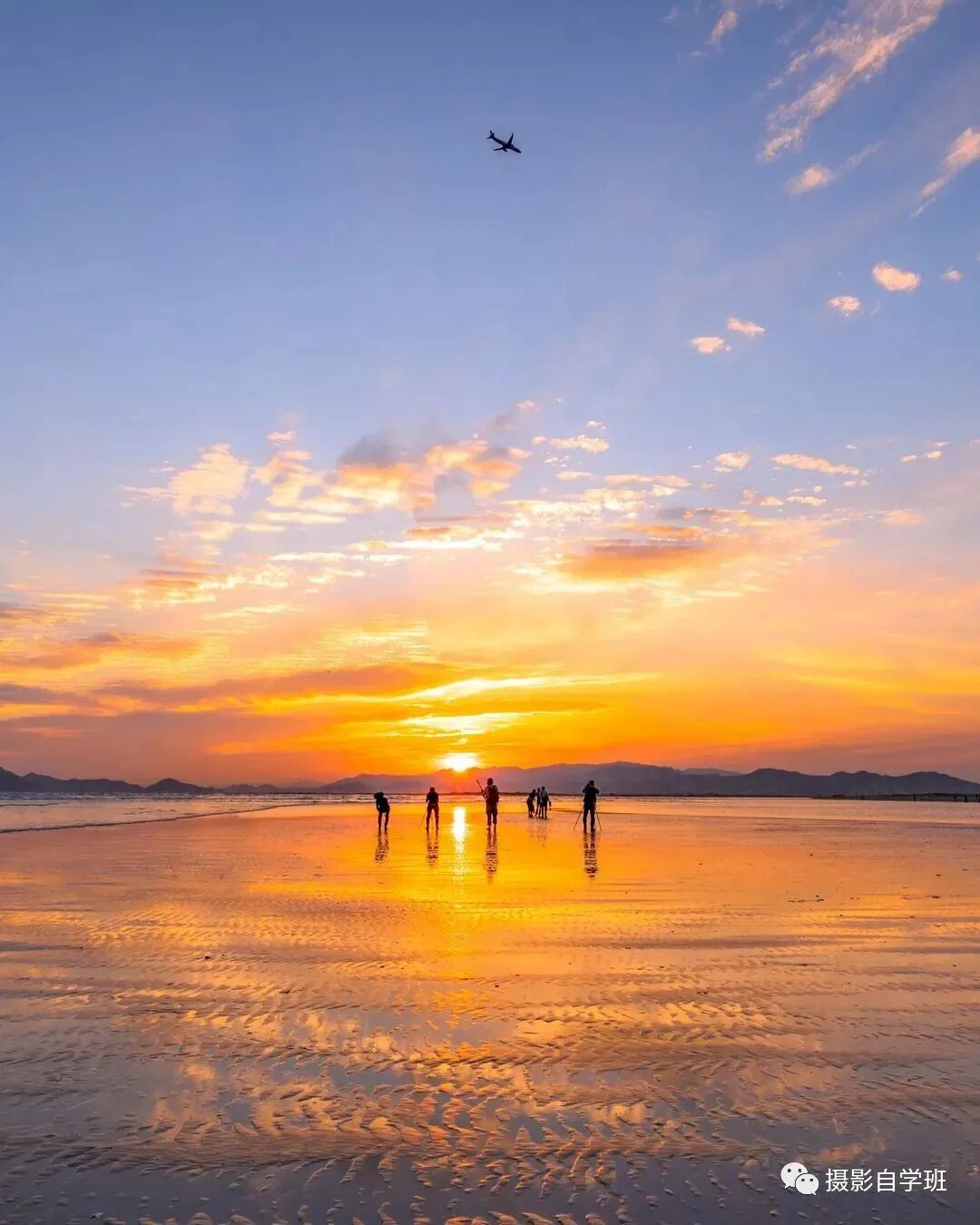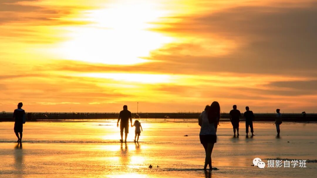 图12逆光拍摄海边的剪影,背景是一个大的画面,这些人形成了点,铺散在画面当中。你要学会顺线拍摄,和找点这个思路,就能够思路打开,更知道怎么创作了。