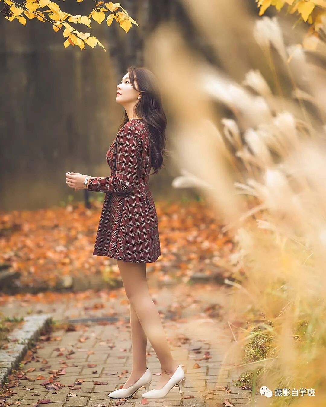 不要学了摆姿,忘了其他的摄影技巧,像图8这样站着,腿一剪一后,两个手放到肚子前,是可以的,抬头看向天空,也没问题,不要忘了用草遮挡镜头,形成一些虚化,给照片拍出层次。