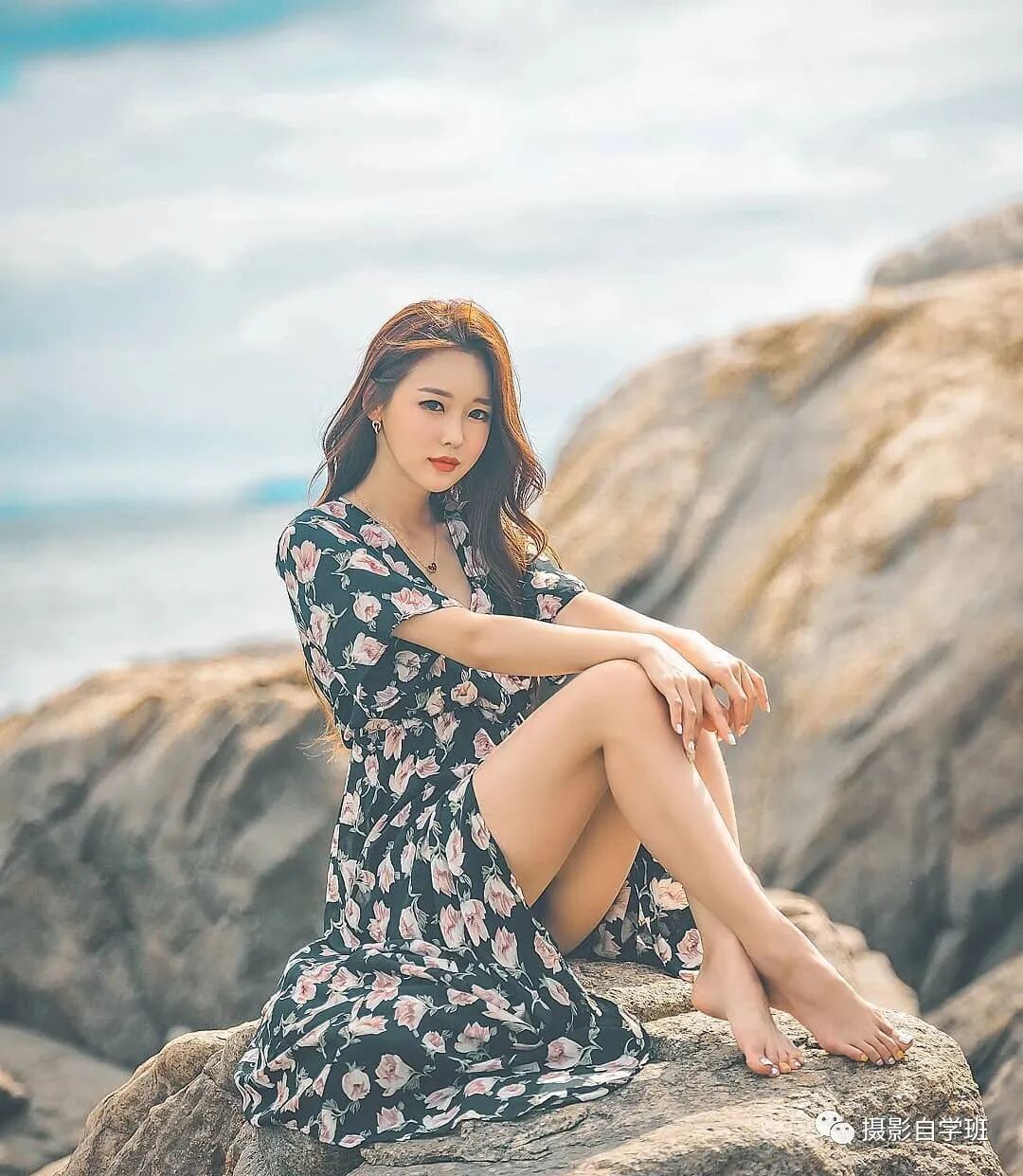 坐着的姿势,想要拍摄得更加自然,那就在大自然当中,找一处石头或者其他的台阶也行,像图6这样坐着,两条腿要有一前一后,胳膊要一高一低,可以像图6这样,看向镜头,也可以引导被拍摄的人,看向地面,自然且随意地在那里,拍出来的画面,就会看起来更加自然。