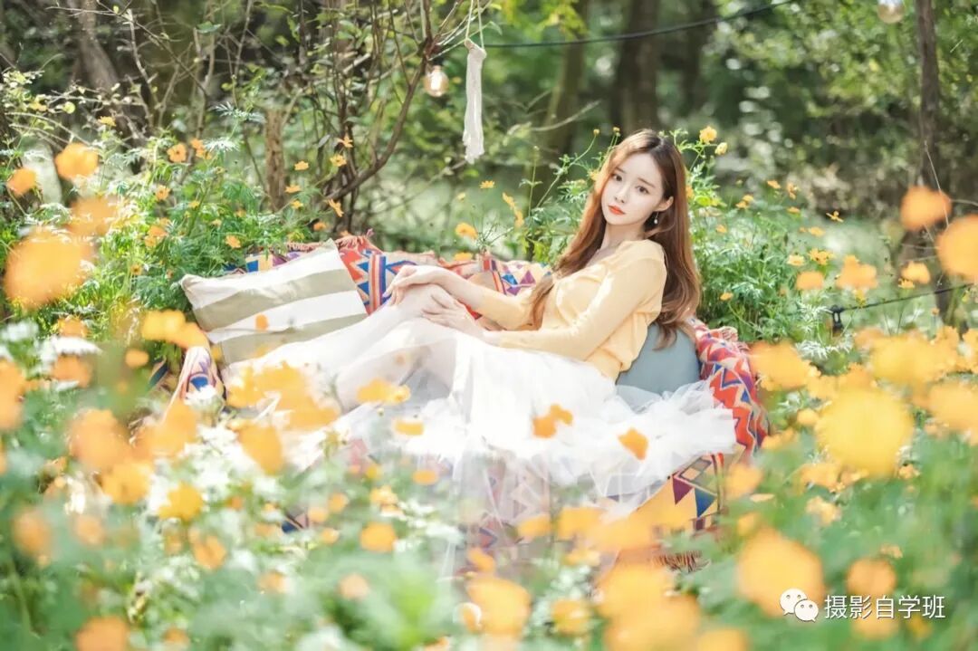 图9这里,因为被拍摄的人,实在没有什么姿势可摆,所以在画面当中,就没有太体现手部,而如果现场有一些植物,可以互动,像图10这样,引导被拍摄的人,用手拿着花,但不要破坏它,居中构图就可以了。