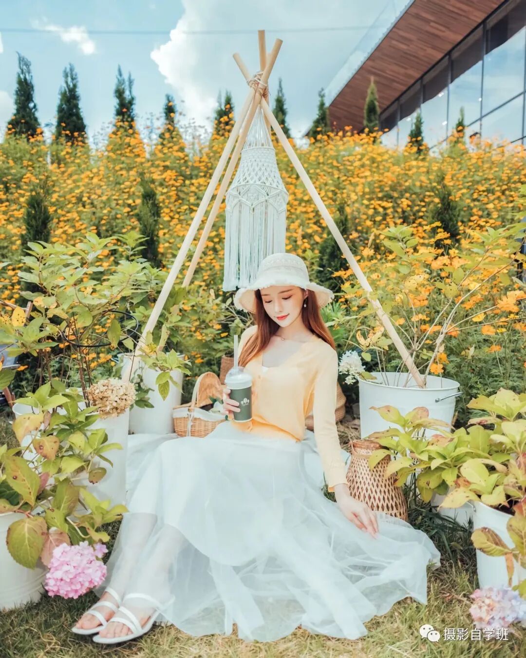 如果中年女士拍摄人像照片,没有姿势可摆,也可以准备一些道具,像图4这样,坐在室外的椅子上,手中拿着奶茶,另外一个手,自然地放在裙边,如果觉得放在唇边很尴尬,那可以像图5与图6这样,把胳膊搭在膝盖上,或者把手搭在膝盖上。