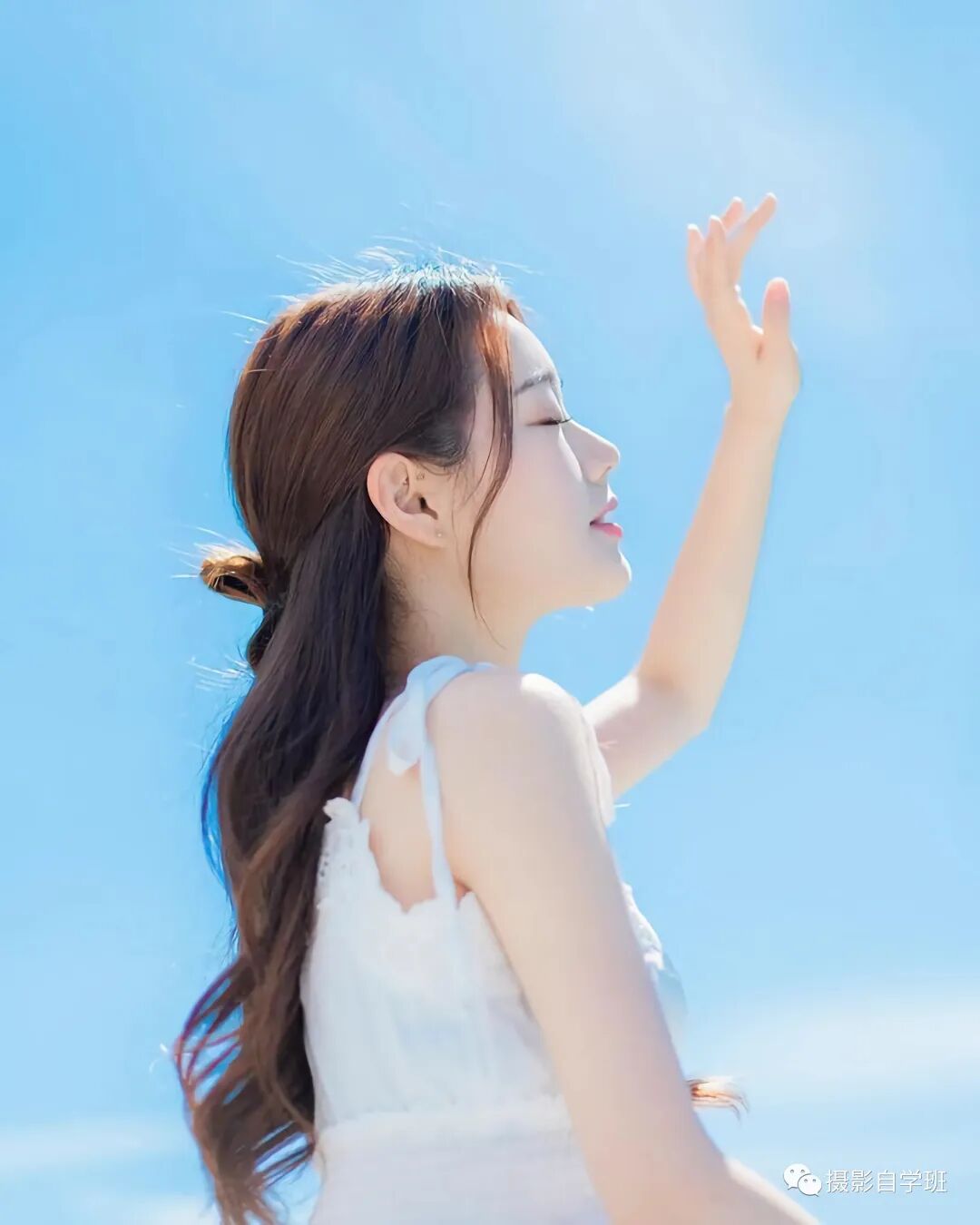 中年女士拍摄照片的时候,如果手不知道放在哪里好,那可以像图2与图3这样,把手抬起来,伸向天空,此时注意手指要打开,不要并拢在一起,可以像图2这样闭着眼睛,享受微风拂面,也可以像图3这样,侧头看向镜头。但侧过来的角度要够,两个眼睛,在画面当中要完全展现,不要只是轻微地侧一点,那样脸会显得很薄,照片看起来太过平面,不够立体,就不好看了。