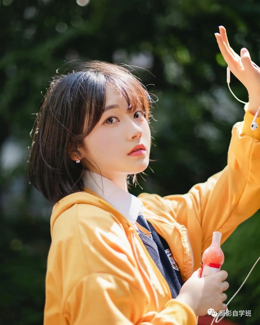 还可以像图8这样,一只手放在下方,另外一只手撩起自己的头发,与自己的身体进行一些互动,那拍摄出来的姿势,会更加自然,不尴尬。
