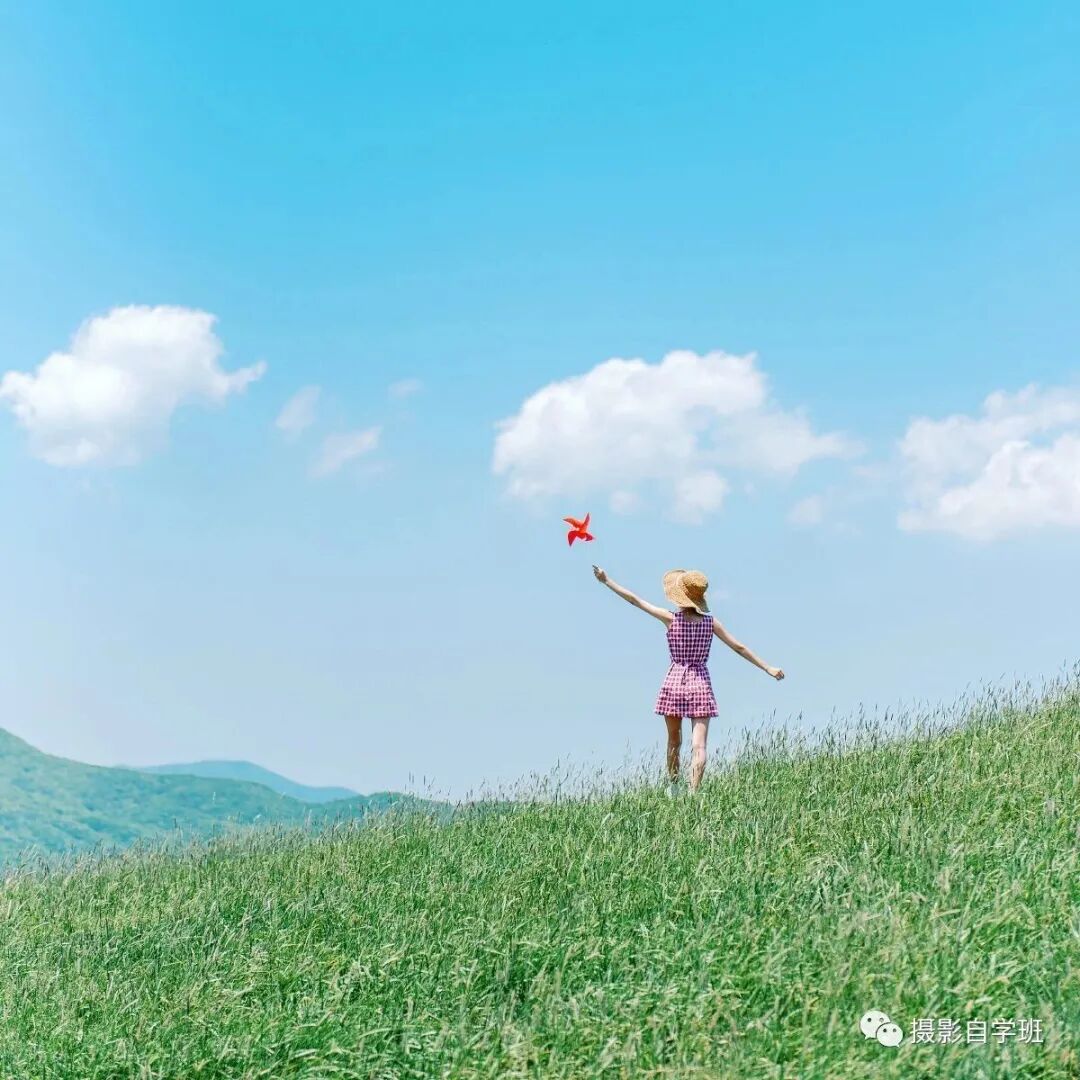 在一组照片中,可以有几张像图5与图6这样的,拍一些背影照片。如果现场有线条,比如图5中的路,那可以引导被拍摄的人,走到小路上。如果没有路,可以选择一些相对高的土坡,让被拍摄的人,站在土坡上,手中拿着一些道具,可以是气球,可以是风车,这样姿势不尴尬,离镜头远,或者根本不看镜头,就能避免表情、眼神不好了。