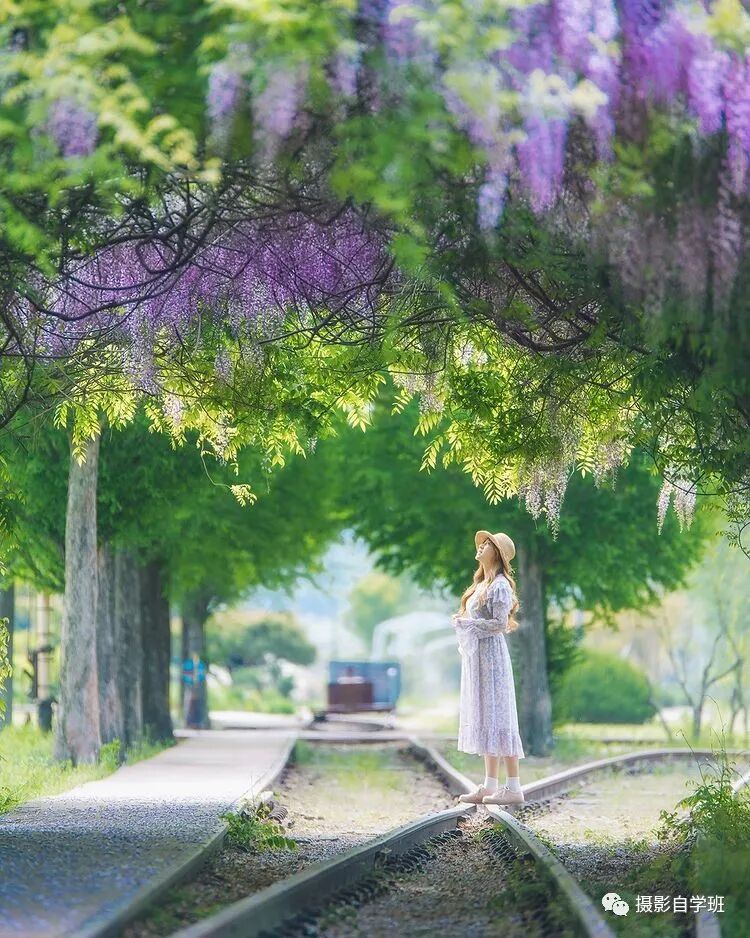 有好的姿势了,还要会构图,引导构图,和环绕构图,很适合在春天拍摄人像照片。图11,就是引导构图,地上的车轨,就是引导线,观者的注意力,会被引导线引导,进而感觉照片更具有纵深感。