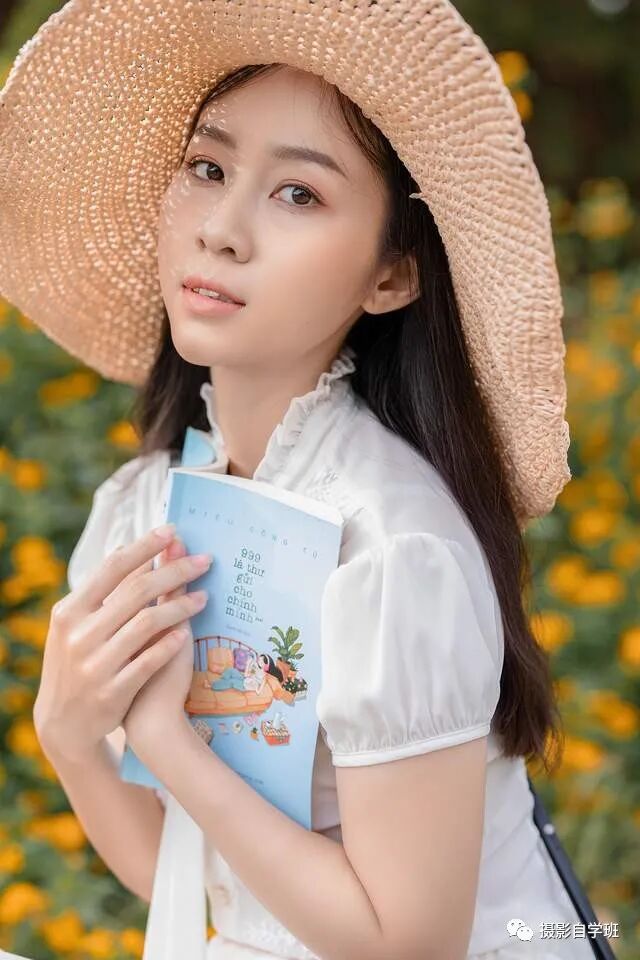 不知道怎么摆姿势,手拿道具就是最好的捷径,双手拿书放在胸前,或者手扶帽子,手拿扇子等等,利用这些拍摄道具,会让人物在画面中更生动,更自然。