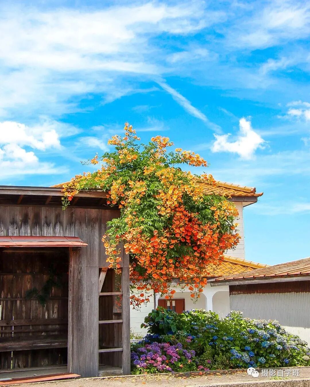 凌霄花常常生长在美丽的环境中,比如山林、草地、湖泊等等。在拍摄时,不要忽略周围的美景,可以将凌霄花作为点缀,突出主题。你看图9这张照片,花很好看,但是背景蓝天、白云,以及周围的建筑,都不错,一组照片中个,如果有很多张着重突出花朵了,那不要忘了,可以像像图9这样,用凌霄花作为点缀、装饰,拍些现场的环境,来丰富你整组凌霄花照片的内容。
