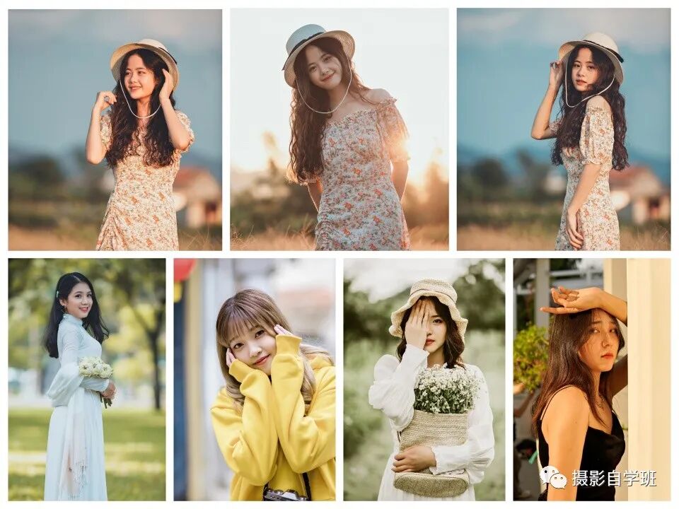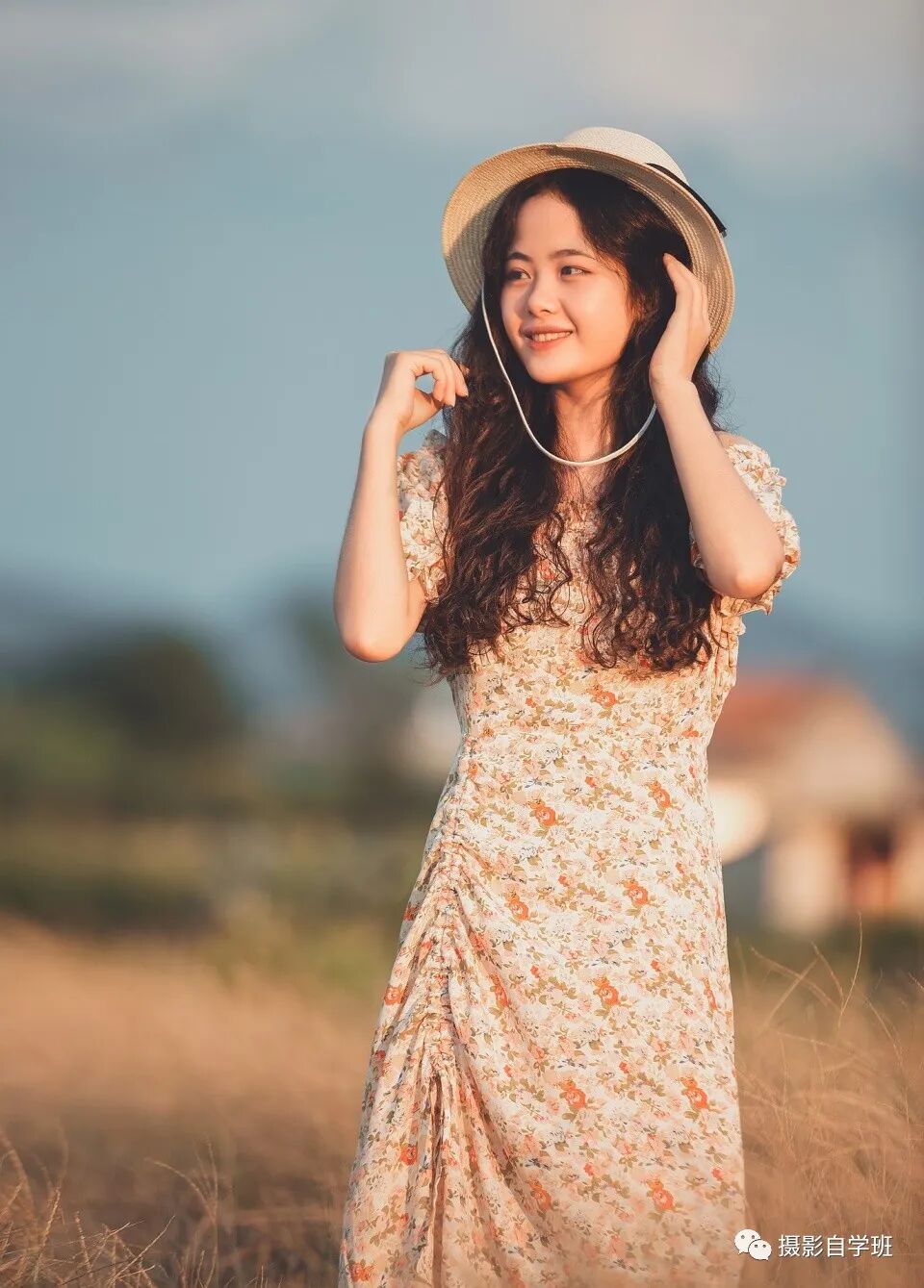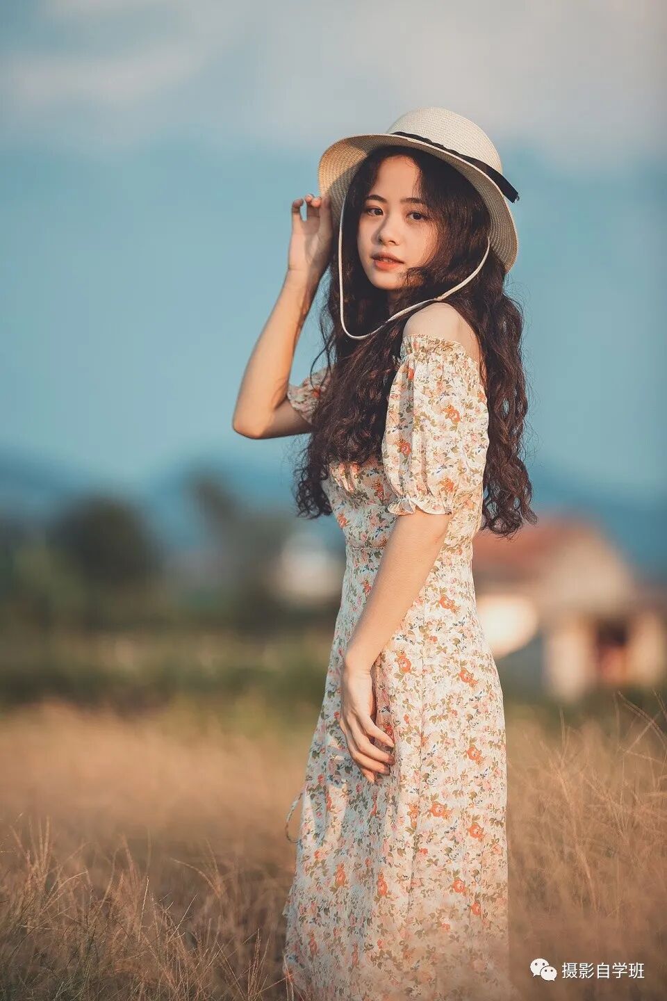 秋天已经来了,我们完全可以到城边的黄草地拍一组照片。逆光的时候,如果太阳太亮,可以像上图这样,让被拍的人,挡住一些太阳,但不要直直地站着,向一侧倾斜一些更好。如果戴帽子,还可以像下图这样,让她手拨弄头发、拨弄帽子。