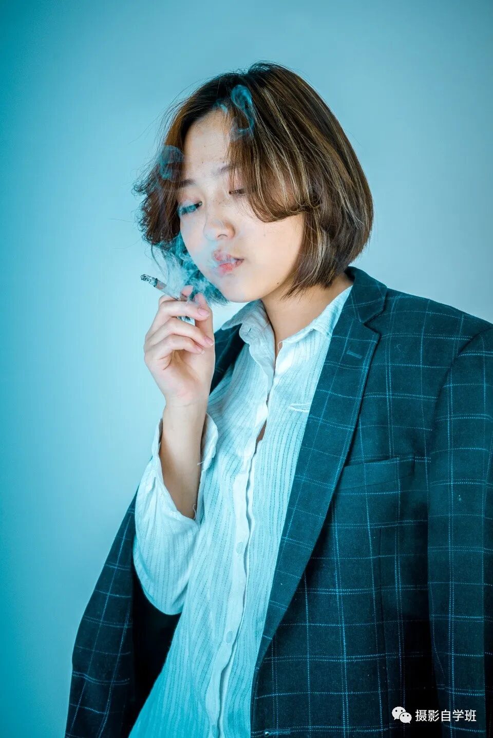 首先,不建议吸烟,有害健康,如果你想拍些酷酷的风格,还想把烟拍出来,那墙前,要有光照到烟雾上,烟雾才能呈现出来,找个西服披身上,就酷起来了。