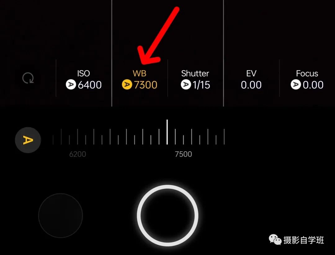 如果是在傍晚时刻就需要等待一下,等光线变暖,再在专业模式当中,找到图8箭头标注的WB,这是白平衡,把这个数值提高之后,你的照片看起来会更加温暖。