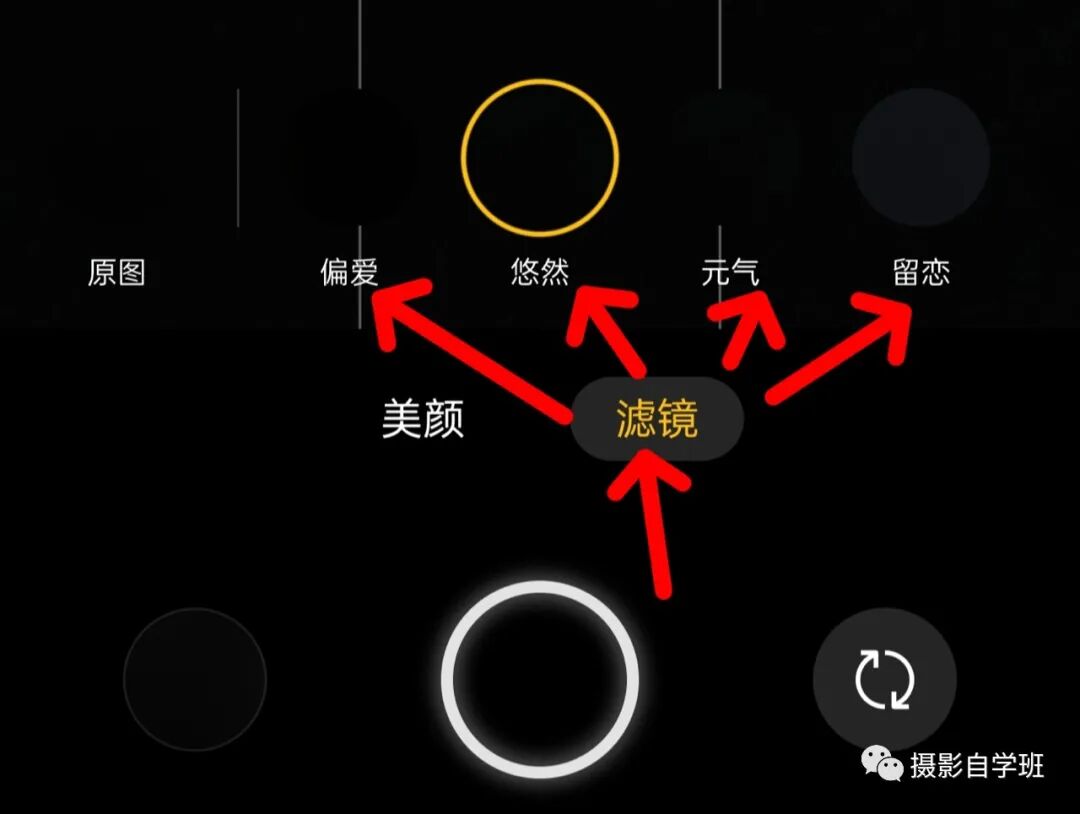那可以像图12、图13标注的这样,打开你手机当中的滤镜功能,如果不确定这个场景,适用于哪个滤镜,那就把多个滤镜,都调整一下。