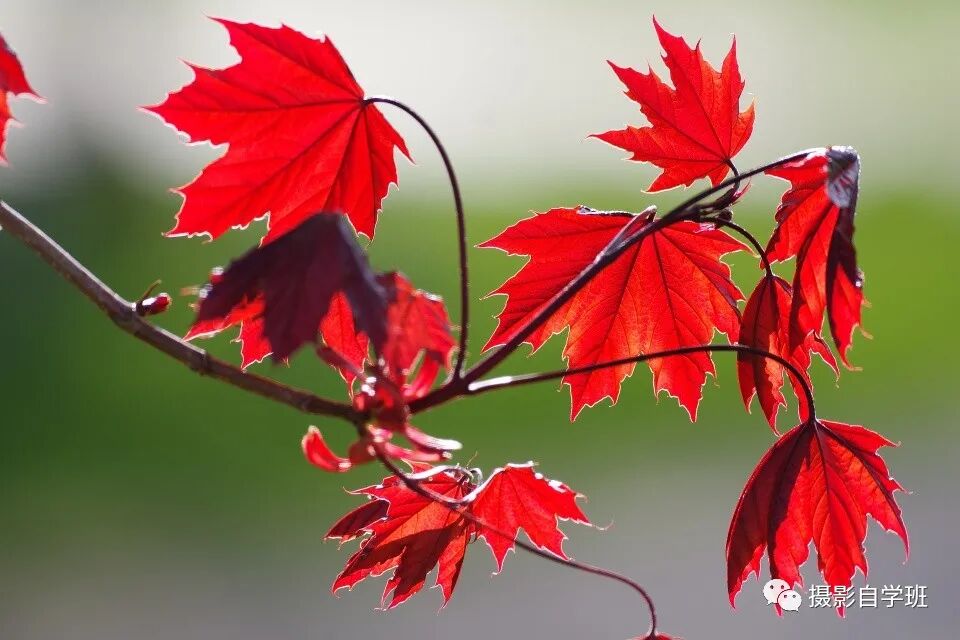 继续走进,只选一个枝条拍,让枝条从画面的一个边缘伸进照片,注意背景,别有挨得太近的其他树叶,这样,前景树叶因为只有一个枝条,就足够突出了,远景因为离得远,虚化就更好了。