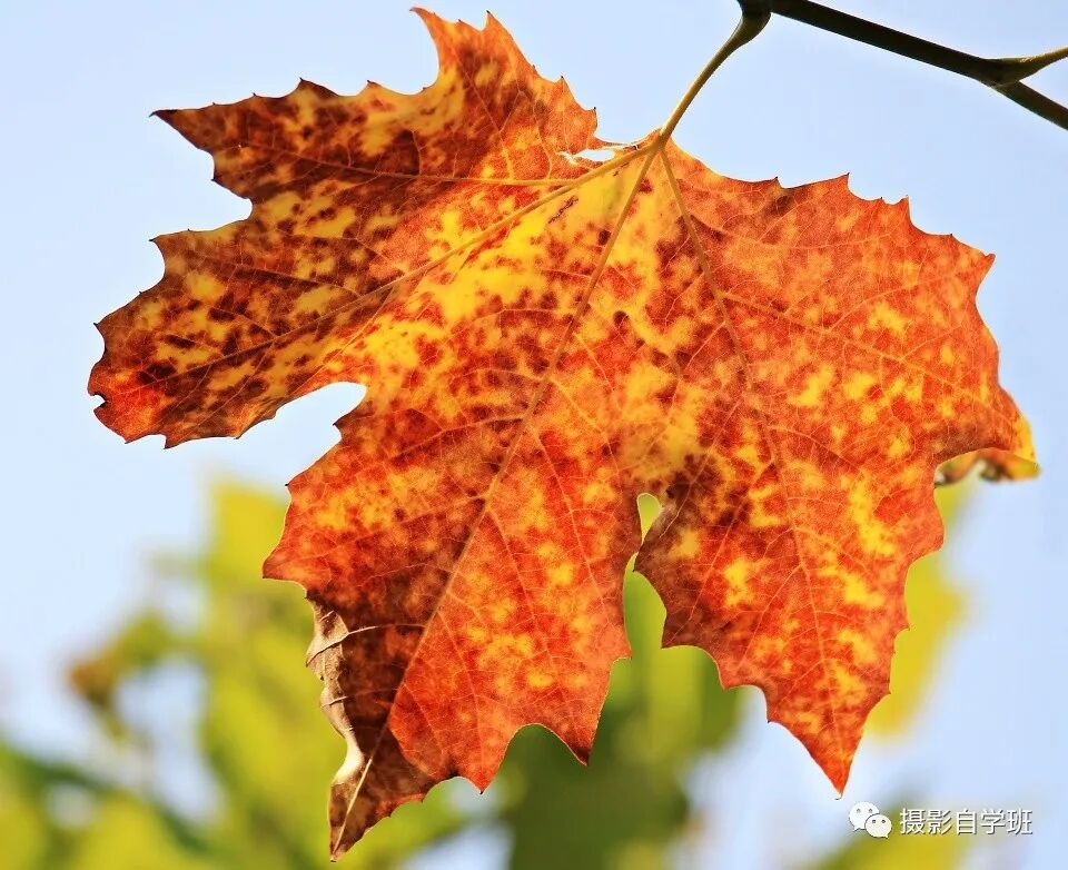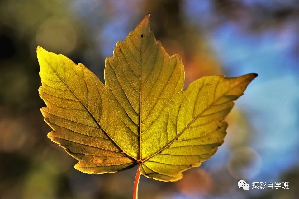 只拍一片好看的树叶。对,就是这么简单,选树叶,就选好看的,只选一叶,照片就不乱。不要单纯以蓝天为背景,树叶够简单了,背景就别太单调,用其他高处的树叶做背景,照片远景还有虚化,就更美了。